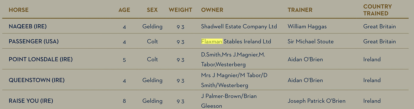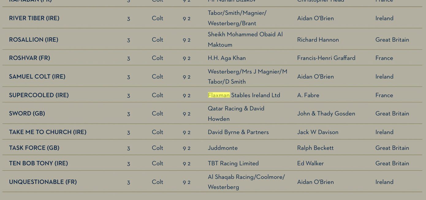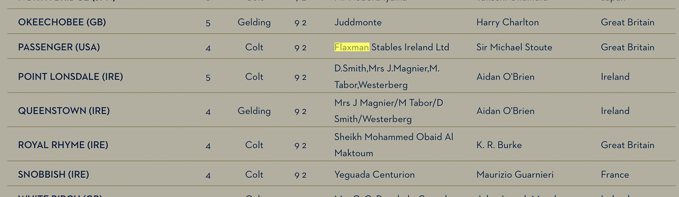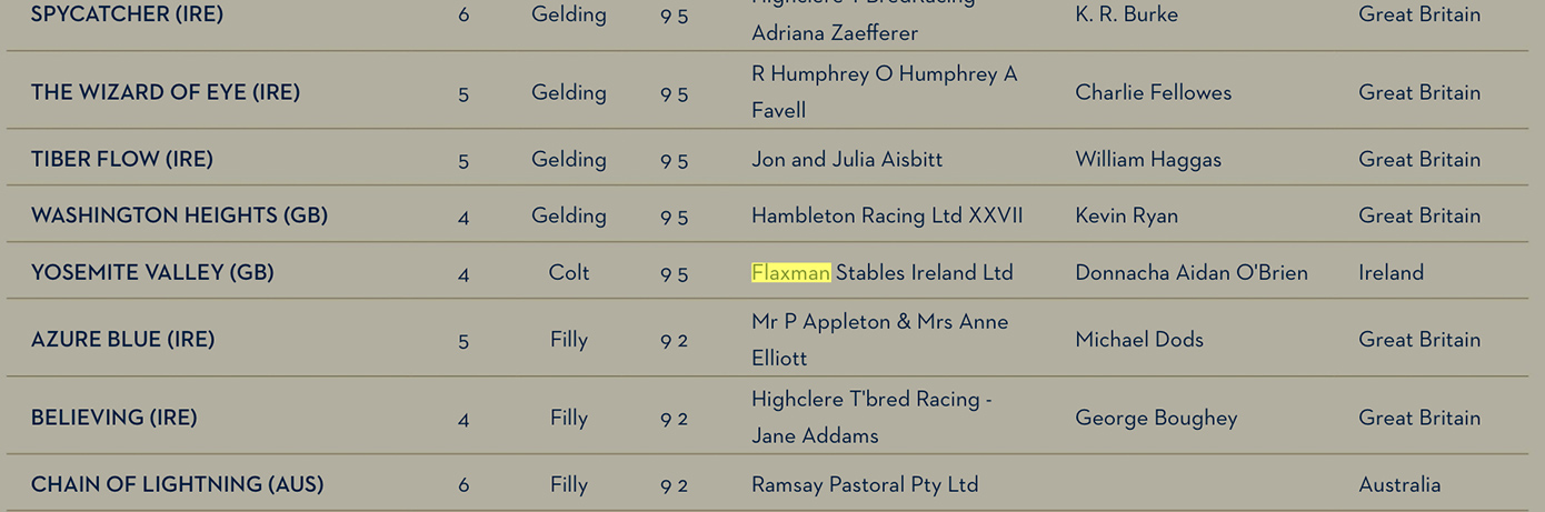 Η Flaxman Holdings έκανε επίσης καμπάνια, αρκετά πρόσφατα, για τους νικητές του Breeders’ Cup Mile, «Six Perfections», «Domedriver» και «Spinning World».