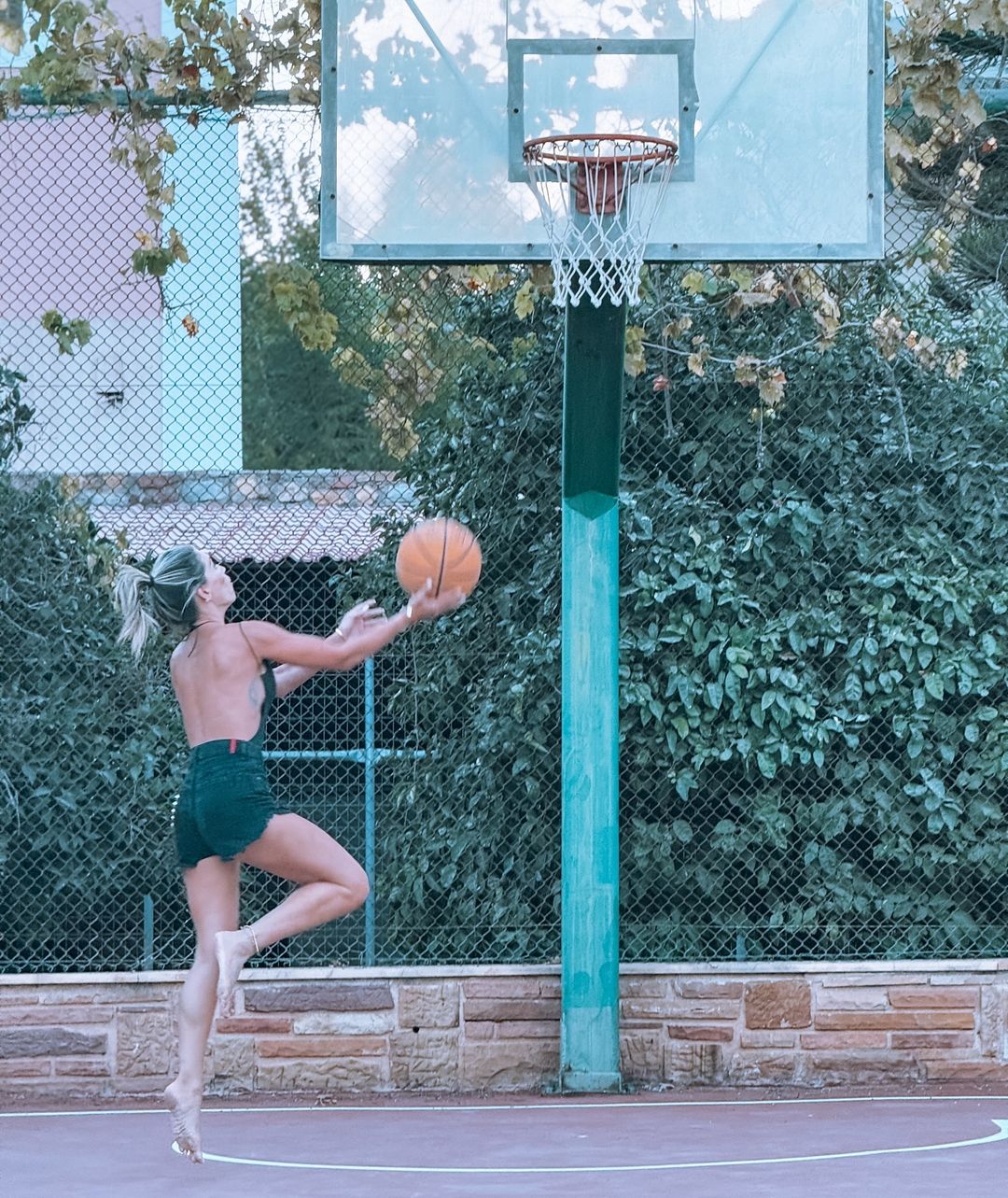 Φορώντας ένα μαύρο σορτσάκι και ένα μαύρο κορμάκι, η Aθηνά Οικονομάκου μπήκε σε ένα ανοιχτό γήπεδο και χωρίς παπούτσια προσπάθησε να παίξει μπάσκετ.