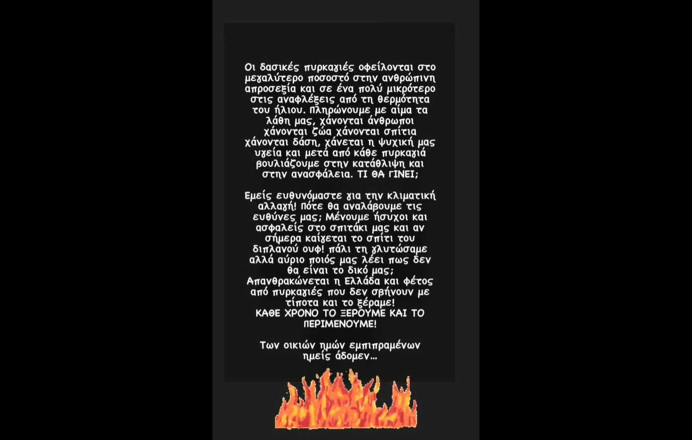 Η τραγουδίστρια στο πρώτο της μήνυμα σημείωσε: «Οι δασικές πυρκαγιές οφείλονται στο μεγαλύτερο ποσοστό στην ανθρώπινη απροσεξία και σε ένα πολύ μικρότερο στις αναφλέξεις από τη θερμότητα του ήλιου. Πληρώνουμε με αίμα τα λάθη μας, χάνονται άνθρωποι χάνονται ζώα χάνονται σπίτια χάνονται δάση, χάνεται η ψυχική μας υγεία και μετά από κάθε πυρκαγιά βουλιάζουμε στην κατάθλιψη και στην ανασφάλεια. Τι θα γίνει; Εμείς ευθυνόμαστε για την κλιματική αλλαγή! Πότε θα αναλάβουμε τις ευθύνες μας; Μένουμε ήσυχοι και ασφαλείς στο σπιτάκι μας και αν σήμερα καίγεται το σπίτι του διπλανού ουφ, πάλι τη γλυτώσαμε αλλά αύριο ποιός μας λέει πως δεν θα είναι το δικό μας; Απανθρακώνεται η Ελλάδα και φέτος από πυρκαγιές που δεν σβήνουν με τίποτα και το ξέραμε! Κάθε χρόνο το ξέρουμε και το περιμένουμε. Των οικιών ημών εμπιπραμένων ημείς άδομεν…».