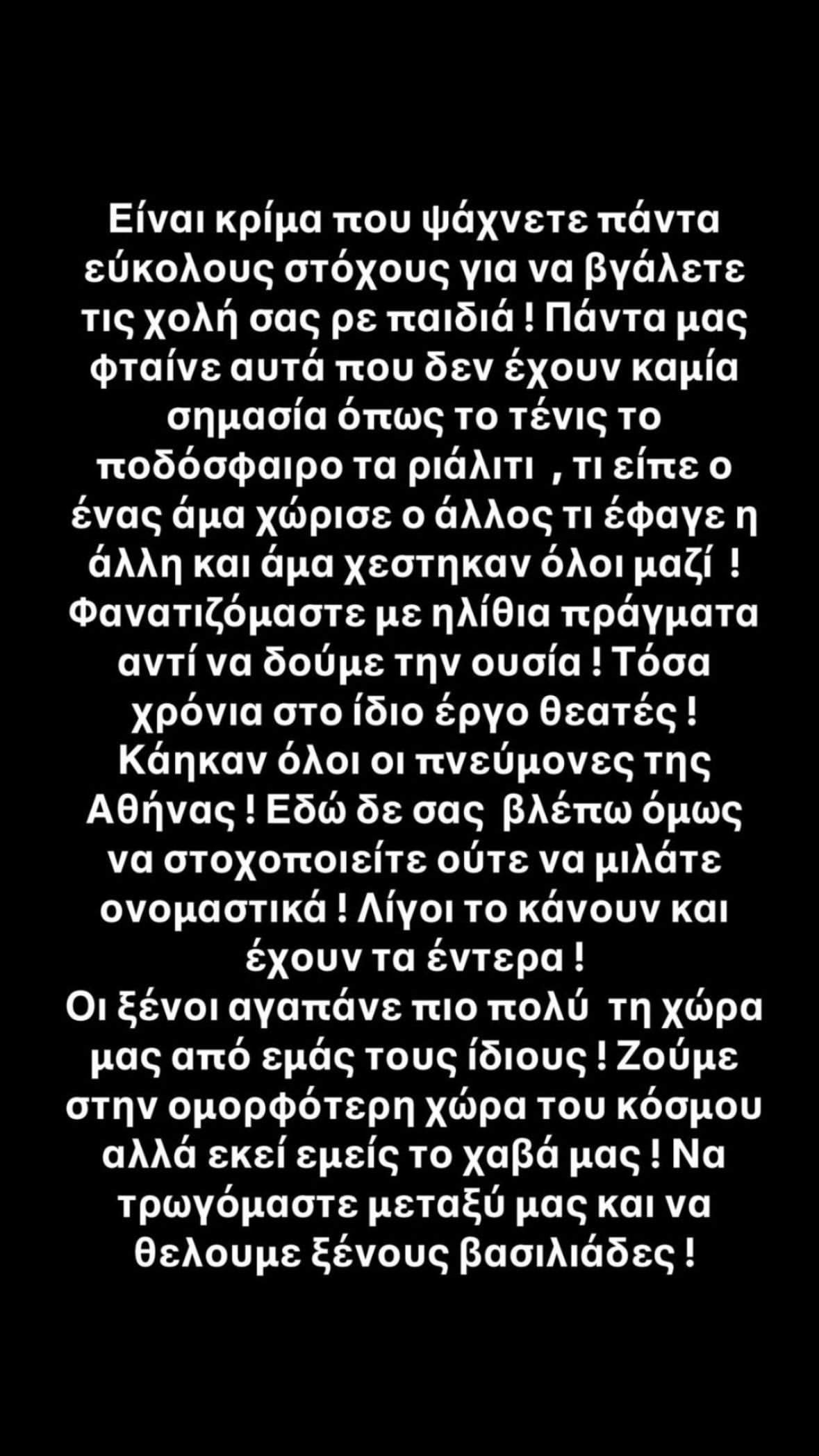 «Είναι κρίμα που ψάχνετε πάντα εύκολους στόχους για να βγάλετε τη χολή σας ρε παιδιά. Πάντα μας φταίνε αυτά που δεν έχουν καμία σημασία όπως το τένις, το ποδόσφαιρο, τα ριάλιτι, τι είπε ο ένας, αν χώρισε ο άλλος, τι έφαγε η άλλη και άμα χέστηκαν όλοι μαζί. Φανατιζόμαστε με ηλίθια πράγματα αντί να δούμε την ουσία.