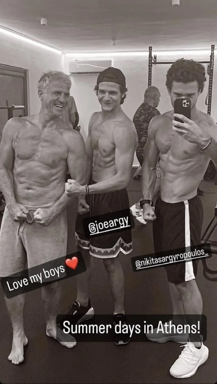 Στη φωτογραφία πατέρας και γιοι απεικονίζονται στο γυμναστήριο, ενώ ποζάρουν μπροστά στον καθρέφτη, δείχνοντας με περηφάνια τα αποτελέσματα της σκλήρης προπόνησης.