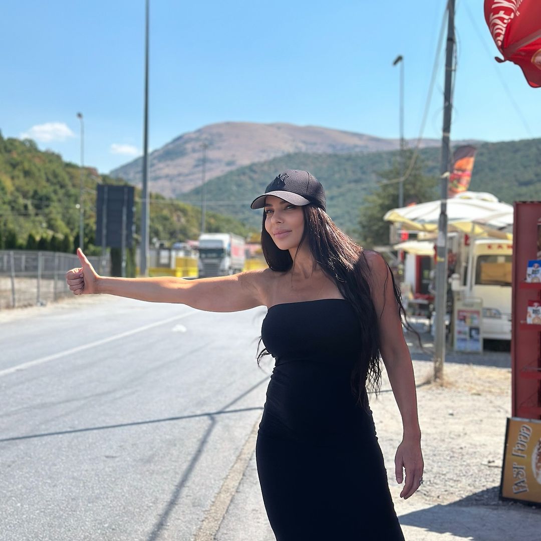 H Kέλλυ Κελεκίδου πόζαρε στον φωτογραφικό φακό φορώντας ένα μαύρο καπέλο και ασορτί φόρεμα. Στην τρίτη φωτογραφία τη βλέπουμε να κάνει το σήμα του οτοστόπ.