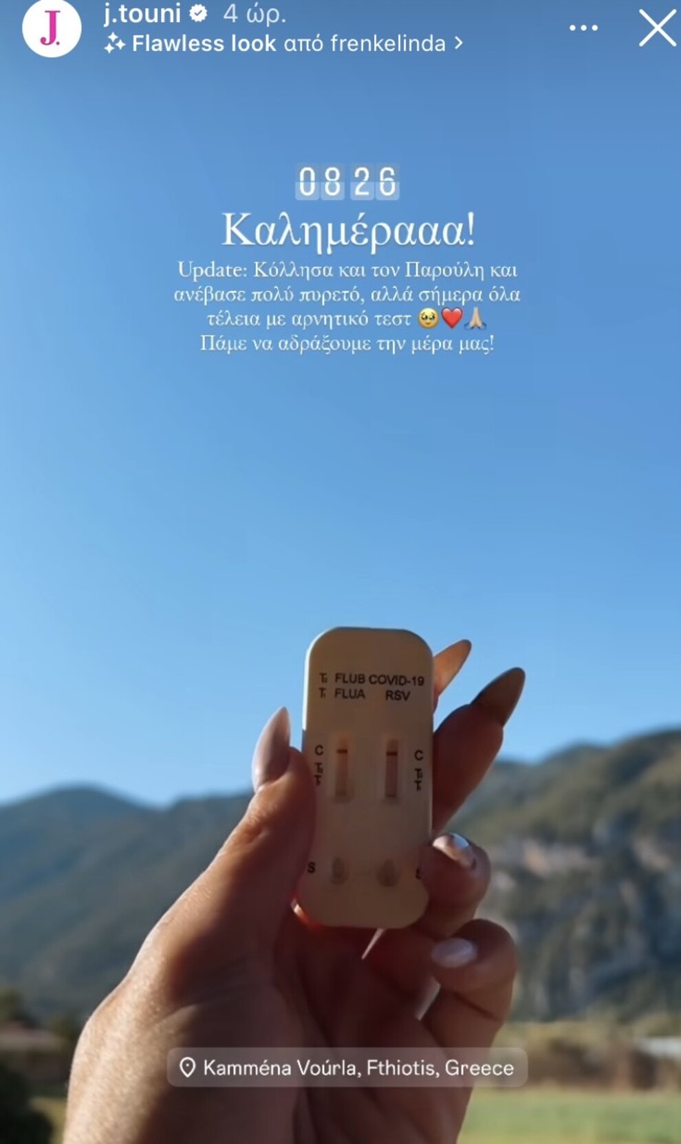 Η γνωστή influencer σε στόρι της στο Instagram έγραψε: «UPDATE: Κόλλησα και τον Παρούλη και ανέβασε πολύ πυρετό αλλά σήμερα όλα τέλεια με αρνητικό τεστ».