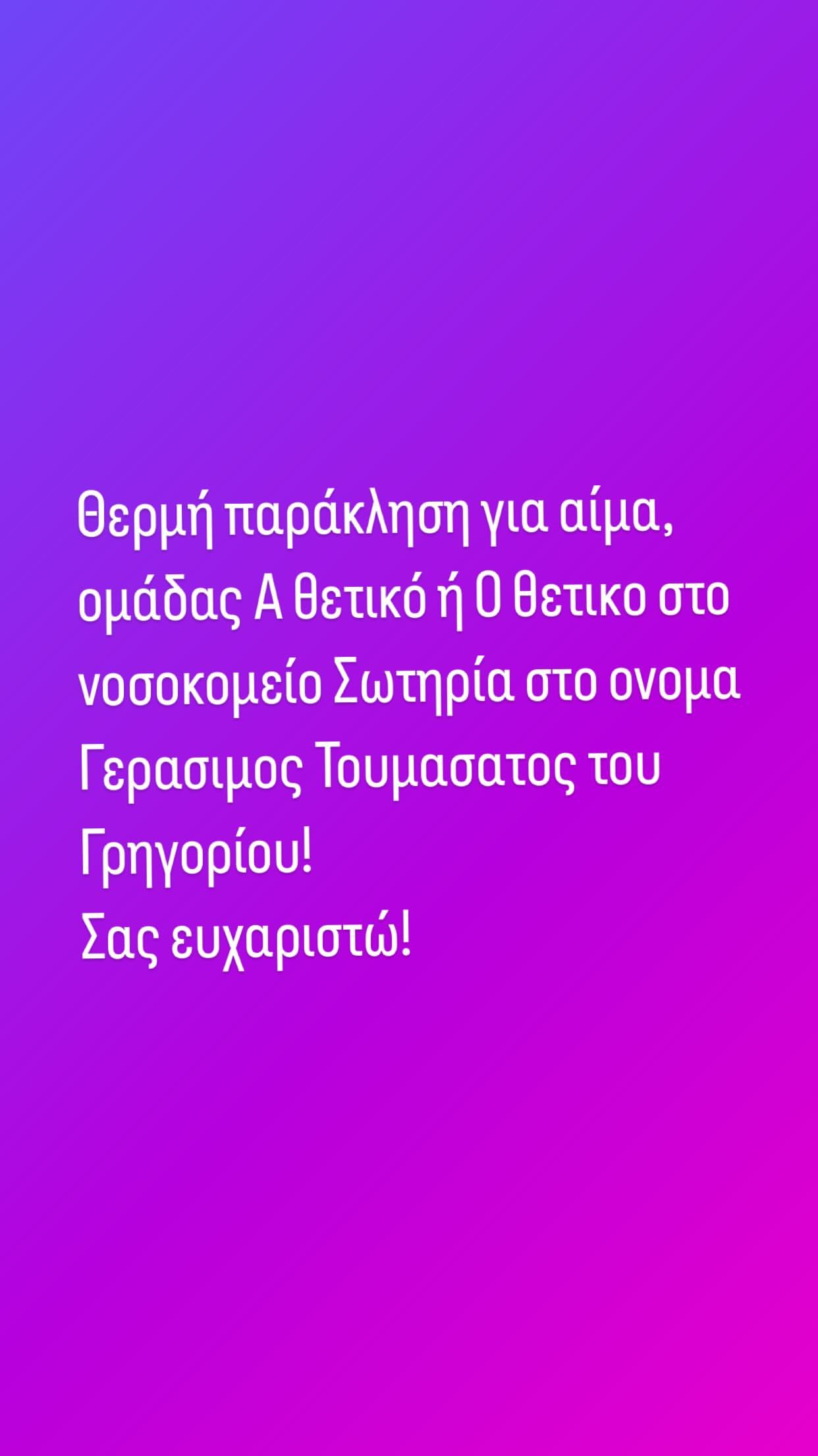 «Θερμή παράκληση για αίμα ομάδας Α Θετικό ή 0 θετικό στο νοσοκομείο Σωτηρία, στο όνομα Γεράσιμος Τουμασάτος του Γρηγορίου. Σας ευχαριστώ!» έγραψε η γνωστή ηθοποιός στα Instagram Stories της.