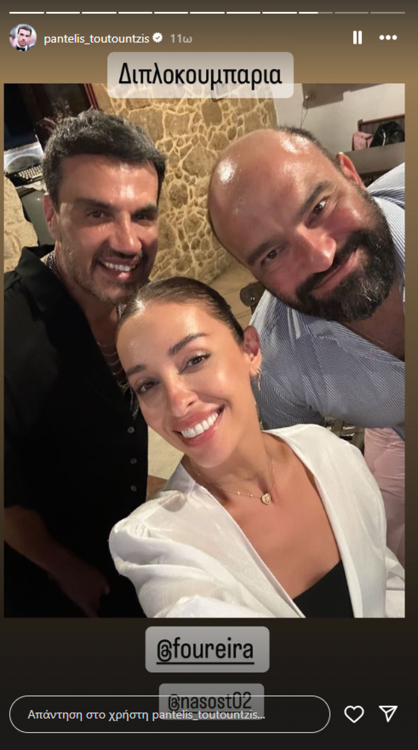 Σε μία από αυτές που δημοσίευσε ο Παντελής Τουτουντζής στον προσωπικό του λογαριασμό στο Instagram, ποζάρει με τον σύντροφό του, Νάσο και την Ελένη Φουρέιρα. «Διπλοκουμπαριά», έγραψε.