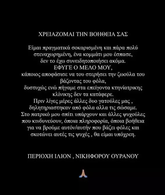 «Είμαι πραγματικά σοκαρισμένη και βαθιά στεναχωρημένη. Ένα κομμάτι μου έσπασε… Δεν μπορώ ακόμα να το πιστέψω. Ο Μέλο μου έφυγε επειδή κάποιος του έδωσε φόλα. Παρότι τον πήγαμε εσπευσμένα σε κτηνιατρική κλινική, δεν τα κατάφερε. Μόλις πριν λίγες ημέρες, δύο άλλες γάτες μας δηλητηριάστηκαν επίσης, αλλά καταφέραμε να τις σώσουμε», έγραψε η Μαριαλένα.