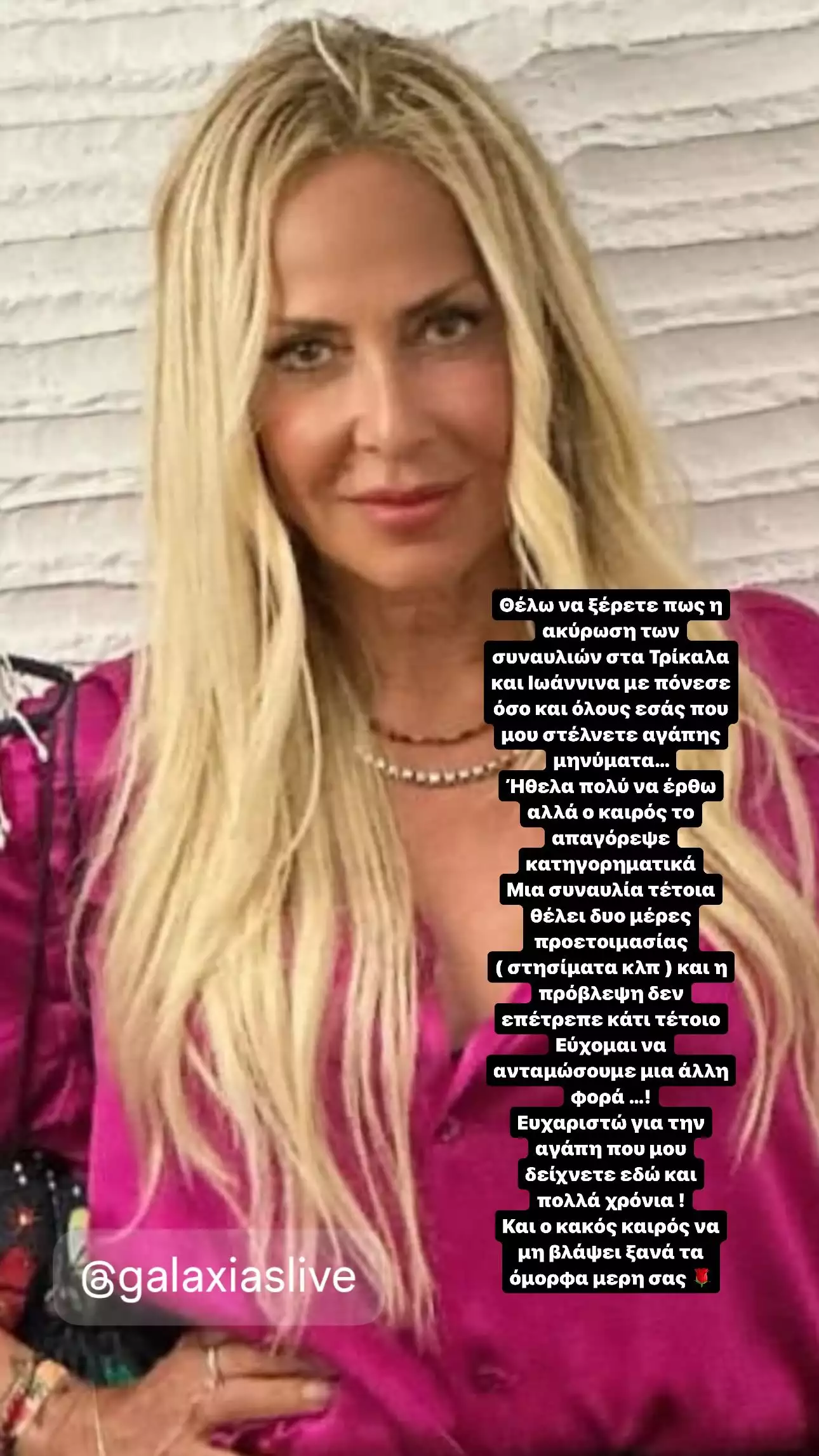 «Θέλω να ξέρετε πως η ακύρωση των συναυλιών στα Τρίκαλα και Ιωάννινα με πόνεσε όσο και όλους εσάς που μου στέλνετε αγάπης μηνύματα. Ήθελα πολύ να έρθω αλλά ο καιρός το απαγόρευσε κατηγορηματικά. Μια τέτοια συναυλία θέλει δυο ημέρες προετοιμασίας και η πρόβλεψη δεν επέτρεπε κάτι τέτοιο. Εύχομαι να ανταμώσουμε μια άλλη φορά! Ευχαριστώ για την αγάπη που μου δείχνετε εδώ και πολλά χρόνια. Και ο κακός καιρός να μη βλάψει ξανά τα όμορφα μέρη σας» έγραψε η Άννα Βίσση στα Instagram Stories της.