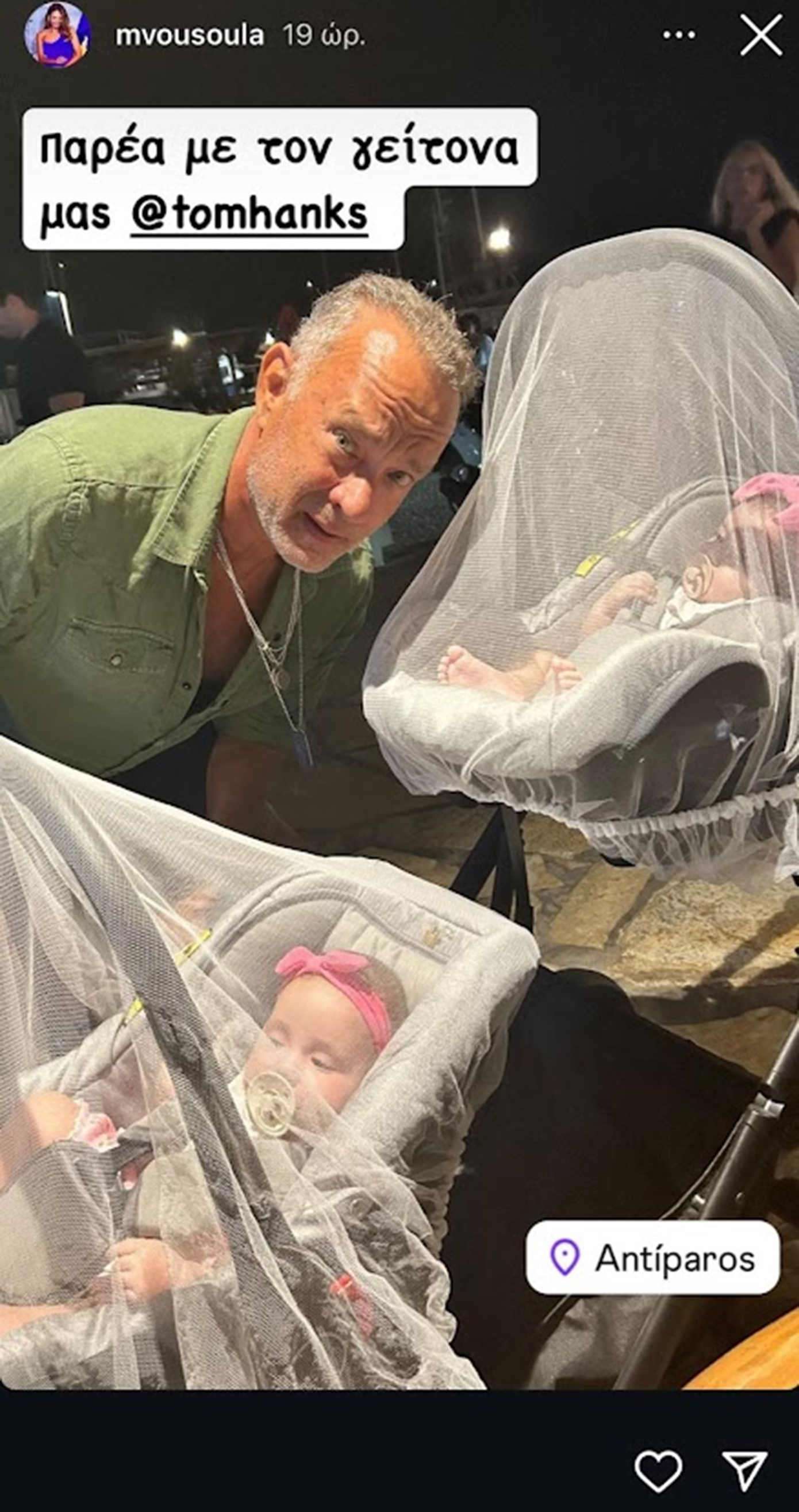«Με τον γείτονά μας Τομ Χανκς» έγραψε η Μαρία Βούσουλα στη φωτογραφία που μοιράστηκε με τους διαδικτυακούς της φίλους στο Instagram, όπου φαίνεται ο Τομ Χανκς να ποζάρει πάνω από το καρότσι με τις κόρες του ζευγαριού.