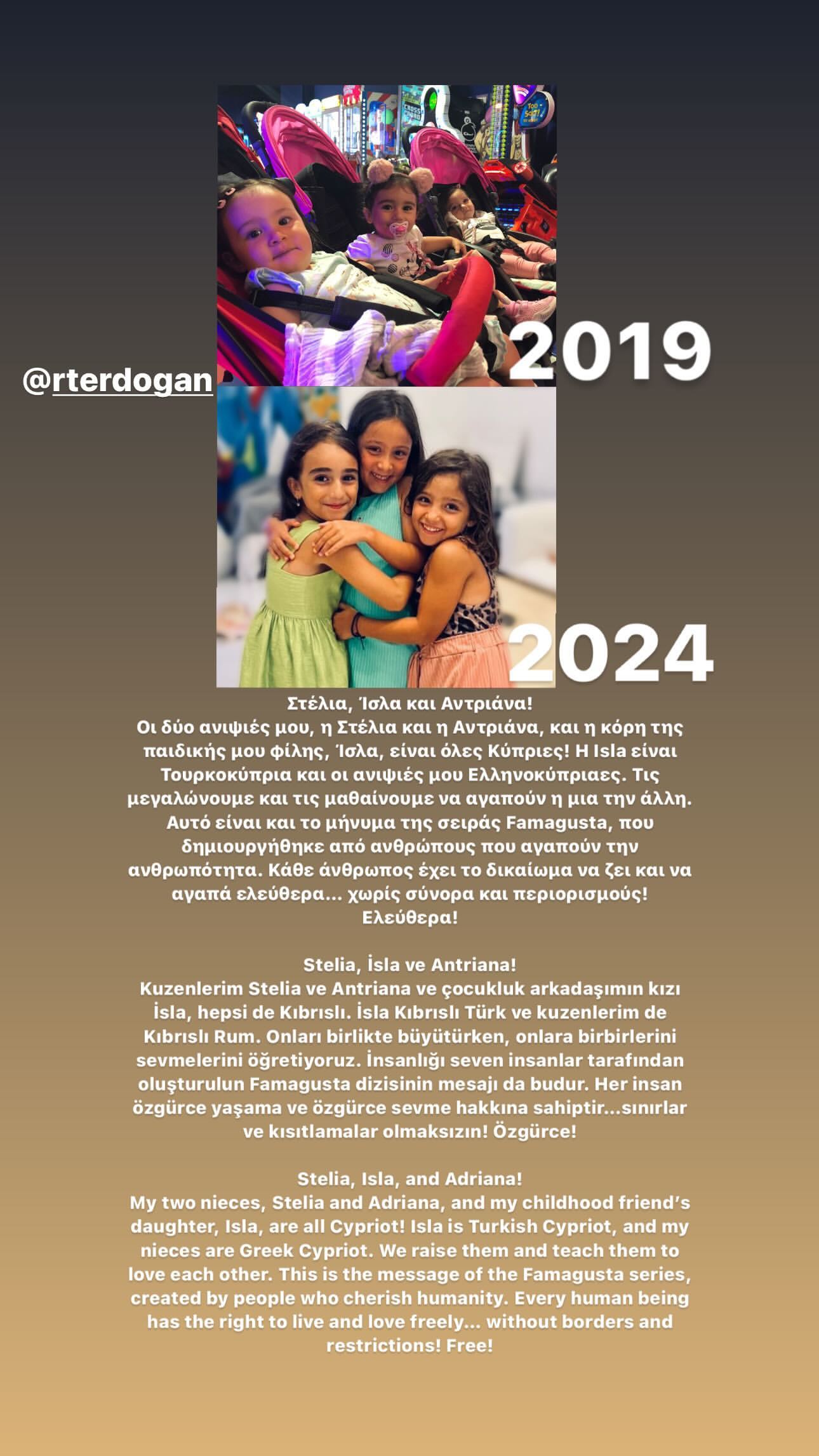 Ο σκηνοθέτης της σειράς δημοσίευσε στο Instagram μία φωτογραφία με τις ανιψιές του και την κόρη της φίλης του και έγραψε: «Στέλια, Ίσλα και Αντριάνα! Οι δυο ανιψιές μου, η Στέλια και η Αντριάνα, και η κόρη της παιδικής μου φίλης, Ίσλα, είναι όλες Κύπριες! Η Isla είναι τουρκοκύπρια και οι ανιψιές μου ελληνοκύπριες. Τις μεγαλώνουμε και τις μαθαίνουμε να αγαπούν η μία την άλλη. Αυτό είναι και το μήνυμα της σειράς Famagusta, που δημιουργήθηκε από ανθρώπους που αγαπούν την ανθρωπότητα. Κάθε άνθρωπος έχει το δικαίωμα να ζει και να αγαπά ελεύθερα… χωρίς σύνορα και περιορισμούς! Ελεύθερα!».