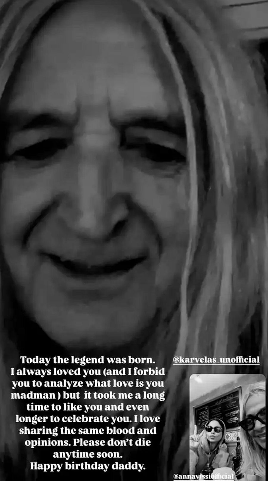 Πιο συγκεκριμένα, μέσα από τον προσωπικό της λογαριασμό στο Instagram, η Σοφία Καρβέλα δημοσίευσε μια εικόνα από το τελευταίο FaceTime που είχε με τον πατέρα της στην οποία και μοιράστηκε τα εξής με τους διαδικτυακούς της φίλους. «Σήμερα γεννήθηκε ο θρύλος. Πάντα σε αγαπούσα (και σου απαγορεύω να αναλύσεις ότι η αγάπη είναι τρελή) αλλά μου πήρε πολύ χρόνο για να σε συμπαθήσω και ακόμη περισσότερο για να σε γιορτάσω».