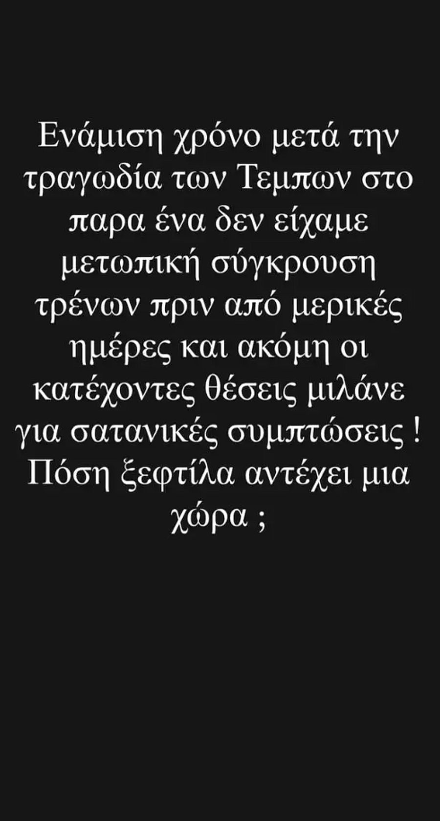 Σε αυτήν, με μαύρο φόντο, η γοητευτική δημοσιογράφος και παρουσιάστρια της πρωινής ενημερωτικής ζώνης του Μεγάλου Καναλιού σημείωσε χαρακτηριστικά τα εξής. «Ενάμιση χρόνο μετά την τραγωδία των Τεμπών, στο παρά ένα δεν είχαμε σύγκρουση τρένων πριν από μερικές ημέρες».