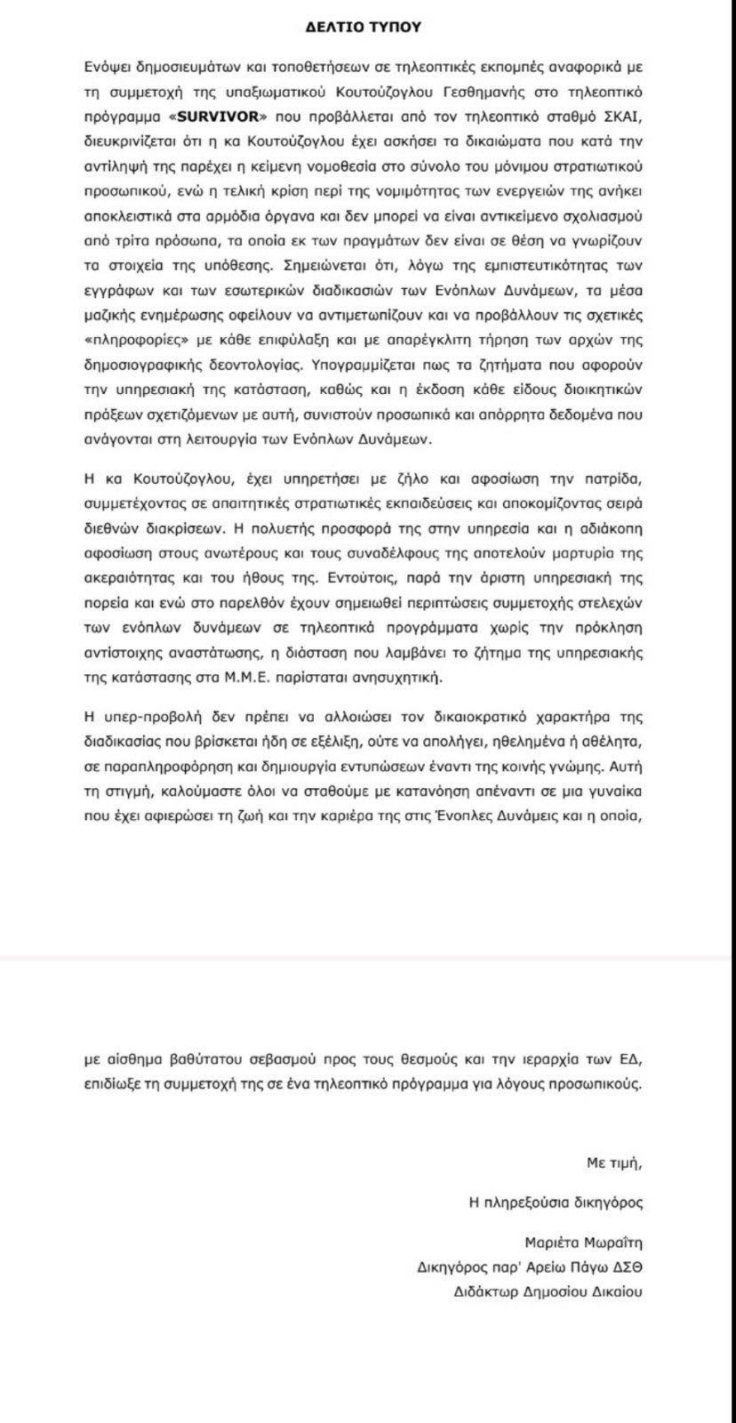 «Ενόψει δημοσιευμάτων και τοποθέτηση σε τηλεοπτικές εκπομπές αναφορικά με τη συμμετοχή της που αξιωματικού Κουτούζογλου Γεσθημανής στο τηλεοπτικό πρόγραμμα Survivor που προβάλλεται από τον τηλεοπτικό σταθμό ΣKAI, διευκρινίζεται ότι κυρία Κοντούζογλου έχει ασκήσει τα δικαιώματα που κατά την αντίληψή της παρέχει η κείμενη νομοθεσία στο σύνολο του μόνιμου στρατιωτικού προσωπικού, ενώ η τελική κρίση περί της νομιμότητας των ενεργειών της ανήκει αποκλειστικά στα αρμόδια όργανα και δεν μπορεί να είναι αντικείμενο σχολιασμού από τρίτα πρόσωπα, τα οποία εκ των πραγμάτων δεν είναι σε θέση να γνωρίζουν τα στοιχεία της υπόθεσης.