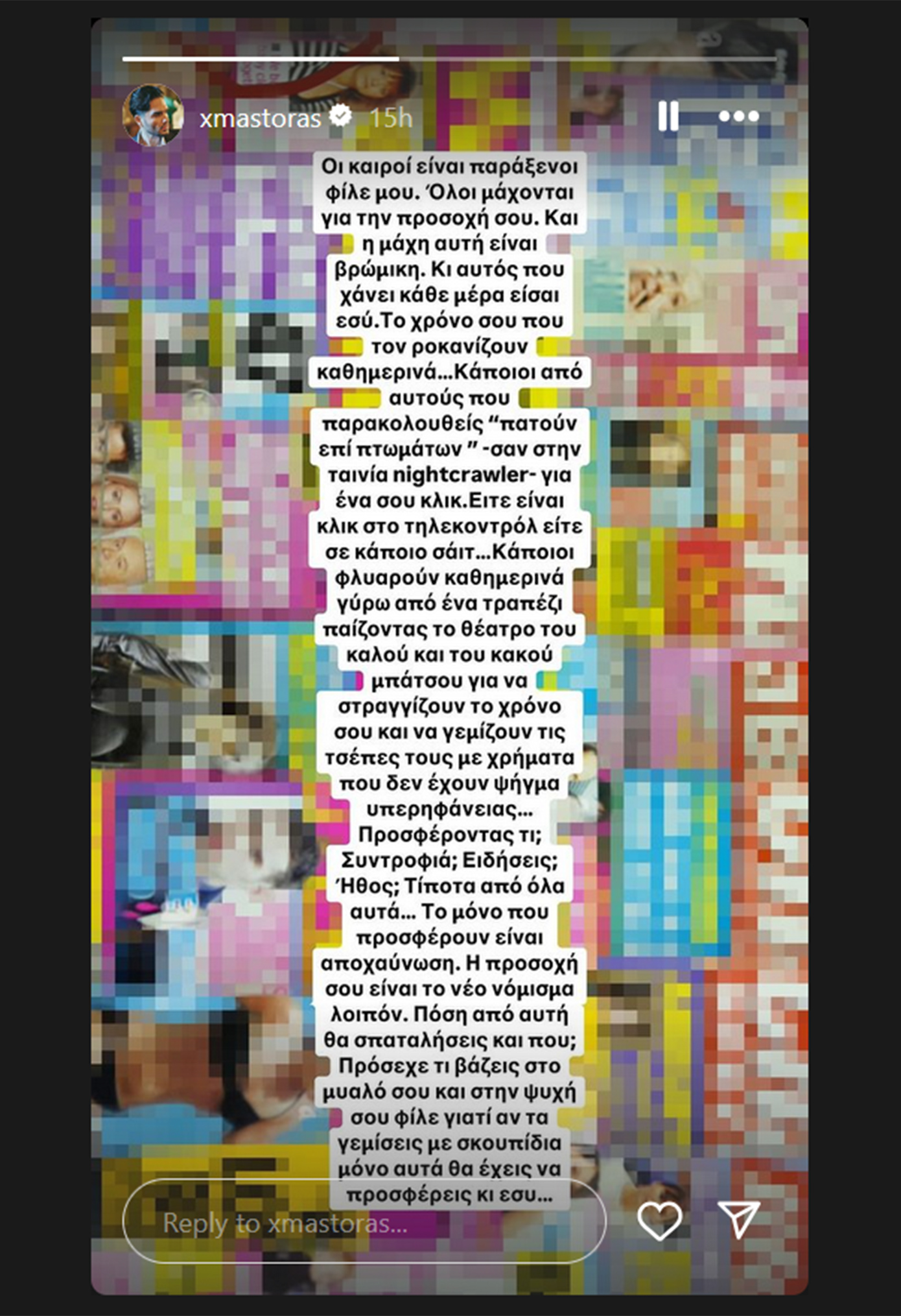 Αναλυτικά, ο Χρήστος Μάστορας έγραψε: «Οι καιροί είναι παράξενοι φίλε μου. Όλοι μάχονται για την προσοχή σου. Και η μάχη αυτή είναι βρώμικη. Κι αυτός που χάνει κάθε μέρα είσαι εσύ. Τον χρόνο σου που τον ροκανίζουν καθημερινά… Κάποιοι από αυτούς που παρακολουθείς “πατούν επί πτωμάτων” – σαν στην ταινία “Nightcrawler” – για ένα σου κλικ. Είτε είναι κλικ στο τηλεκοντρόλ είτε σε κάποιο site. Κάποιοι φλυαρούν καθημερινά γύρω από ένα τραπέζι παίζοντας το θέατρο του καλού και του κακού μπάτσου για να στραγγίζουν τον χρόνο σου και να γεμίζουν τις τσέπες τους με χρήματα που δεν έχουν ψήγμα υπερηφάνειας…