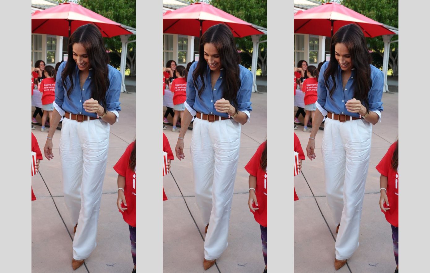 Η Μέγκαν Μαρκλ έδειχνε ισορροπημένη και στιλάτη με ένα ψηλόμεσο κρεμ παντελόνι και ένα άνετο και ευάερο μπλε λινό πουκάμισο για την περίσταση, απογειώνοντας το σύνολό της με ένα ζευγάρι σουέντ γόβες.