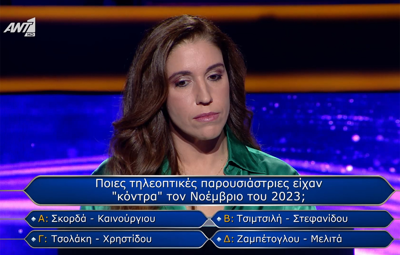 Συγκεκριμένα, η παίκτρια του «Εκατομμυριούχου» κλήθηκε να απαντήσει στην εξής ερώτηση: «Ποιες τηλεοπτικές παρουσιάστριες είχαν κόντρα τον Νοέμβριο του 2023;». Τα ζευγάρια ανάμεσα στα οποία έπρεπε να επιλέξει η παίκτρια ήταν τα Σκορδά-Καινούργιου, Τσιμτσιλή-Στεφανίδου, Τσολάκη-Χριστίδου και Ζαμπέτογλου-Μελιτά.