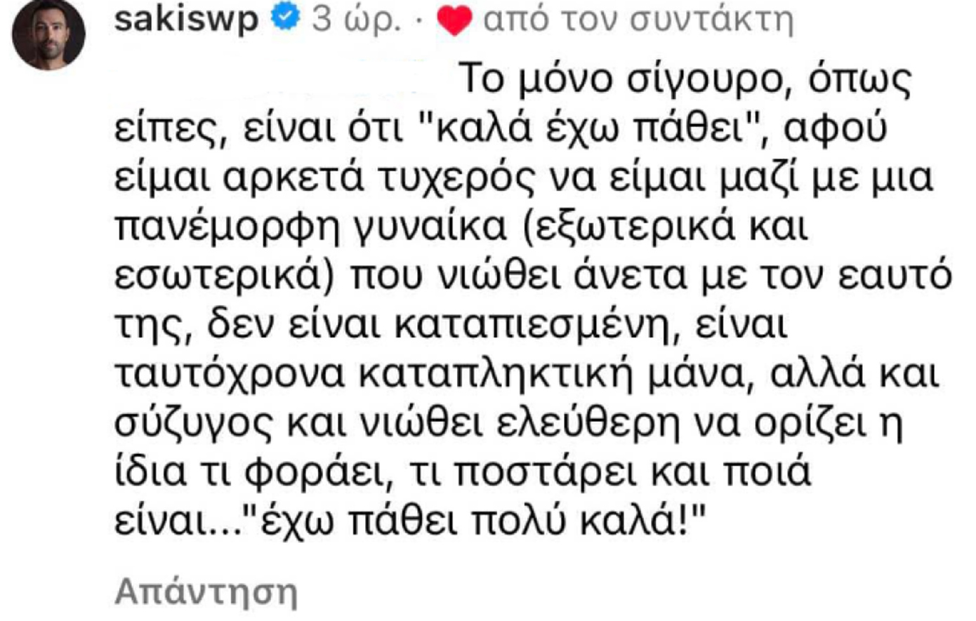 Μάλιστα, στο σχόλιο του Σάκη Τανιμανίδη απάντησε και η Χριστίνα Μπόμπα, η οποία έγραψε: «Κι εγώ έχω πάθει καλά!».
