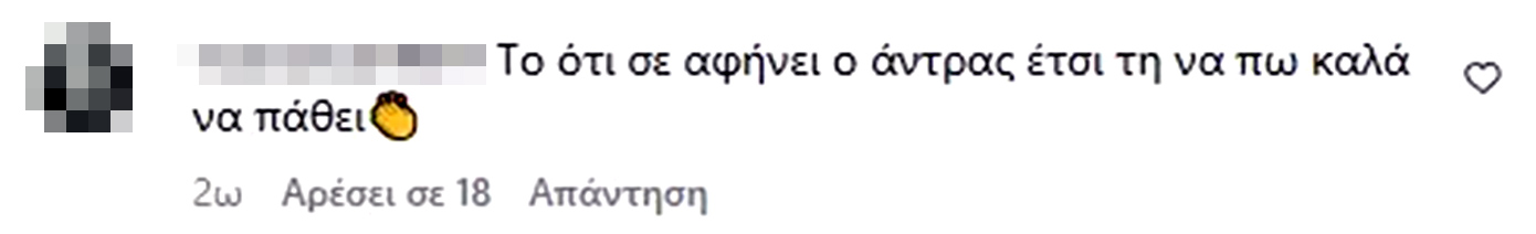 Η influencer δέχτηκε πολλά μηνύματα, ωστόσο υπήρξε και μία follower που της έγραψε κάτω από την ανάρτηση: «Tο ότι σε αφήνει ο άντρας έτσι, τι να πω καλά να πάθει».