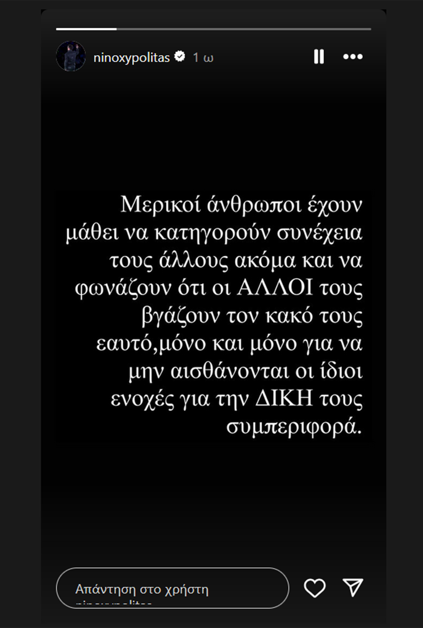 Χαρακτηριστικά ο Νίνο έγραψε στα Instagram Stories: «Μερικοί άνθρωποι έχουν μάθει να κατηγορούν συνέχεια τους άλλους, ακόμα και να φωνάζουν ότι οι ΆΛΛΟΙ τους βγάζουν τον κακό τους εαυτό, μόνο και μόνο για να μην αισθάνονται οι ίδιοι ενοχές για τη ΔΙΚΗ τους συμπεριφορά».