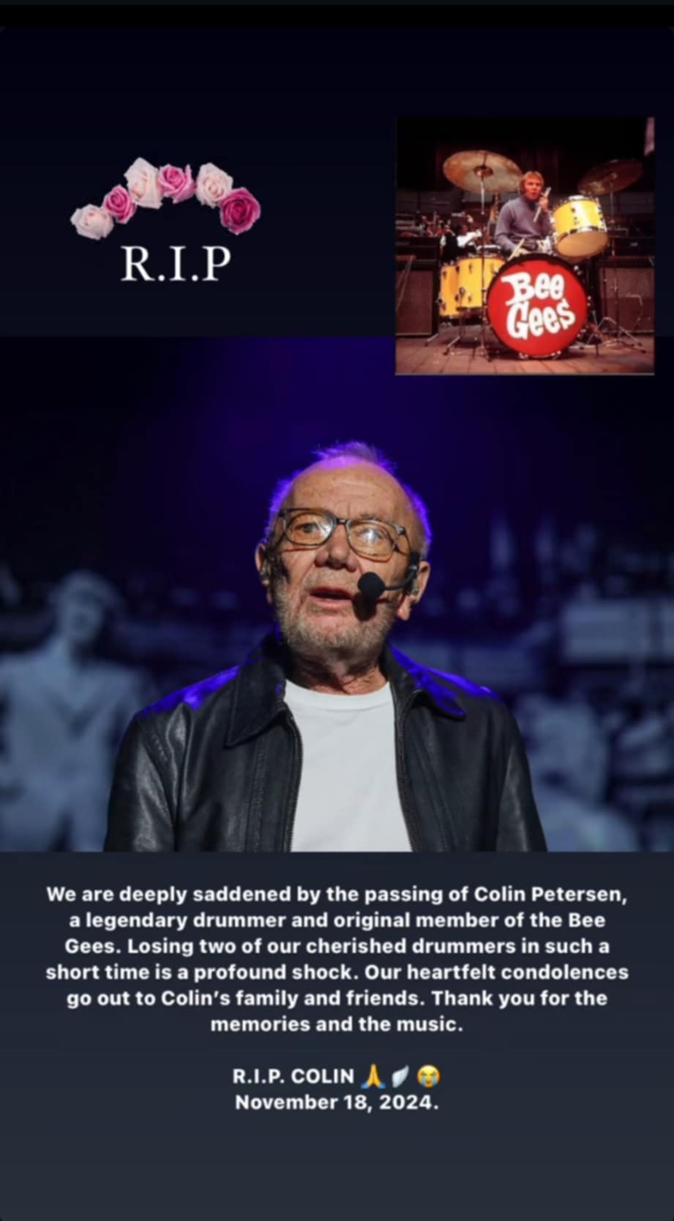 «Είμαστε βαθιά θλιμμένοι από τον θάνατο του Κόλιν Πίτερσεν, ενός θρυλικού ντράμερ και αρχικού μέλους των Bee Gees», έγραψε ο Ρόμπιν.