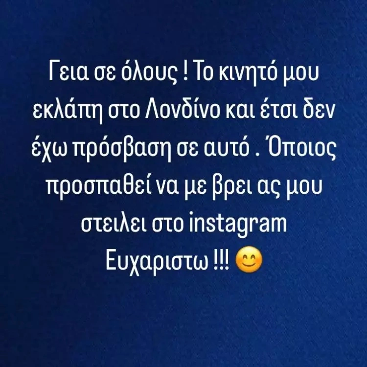 «Γεια σε όλους. Το κινητό μου εκλάπη στο Λονδίνο και έτσι δεν έχω πρόσβαση σε αυτό. Όποιος προσπαθεί να με βρει ας μου στείλει στο Instagram. Ευχαριστώ!!!» έγραψε η Τάνια Μπρεάζου.