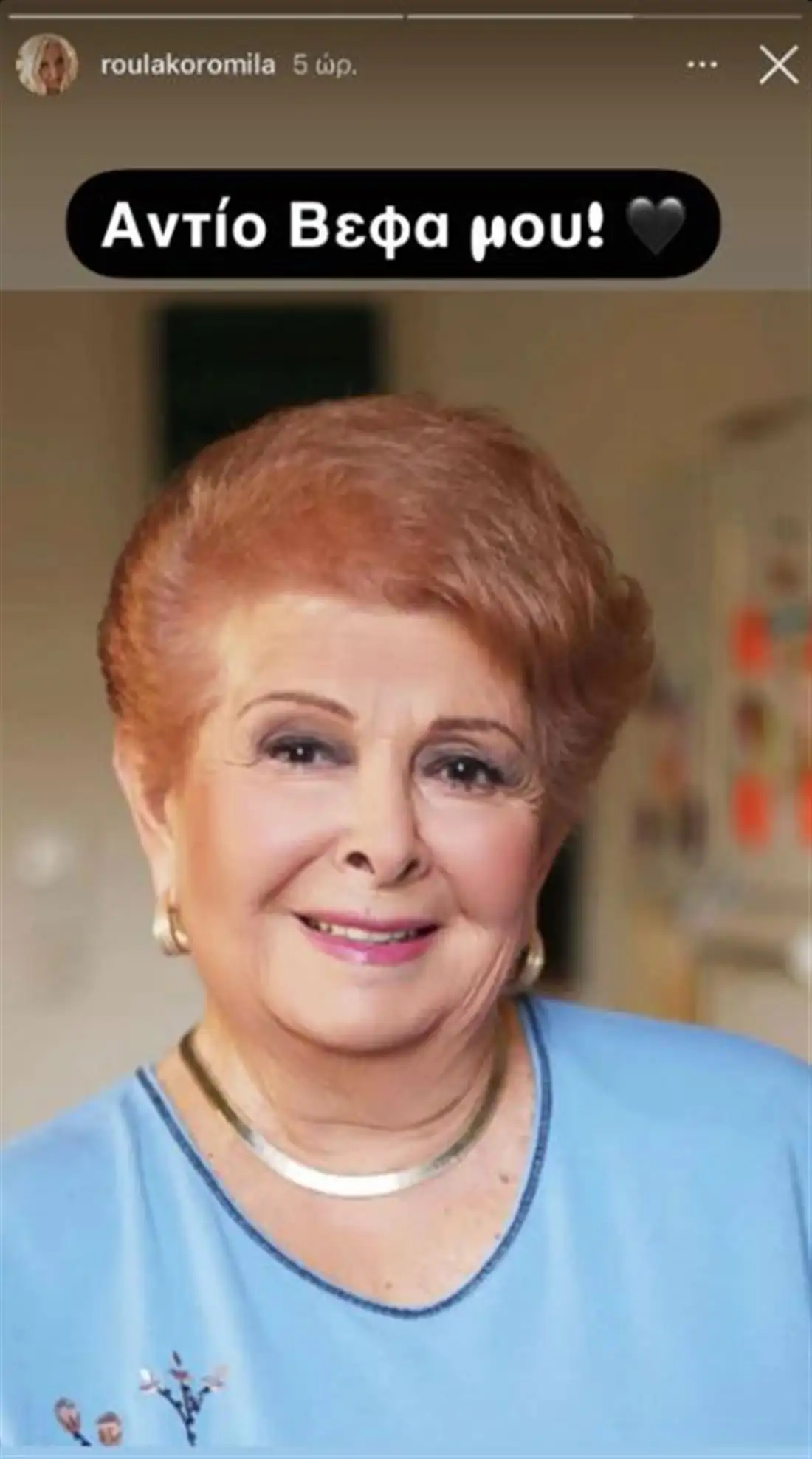 Η Ρούλα Κορομηλά, η οποία είχε συνεργαστεί με τη Βέφα Αλεξιάδου, θέλησε να στείλει το δικό της αποχαιρετιστήριο μήνυμα για την απώλεια της 91χρονης μαγείρισσας και έτσι μέσα από τον προσωπικό της λογαριασμό στο Instagram ανάρτησε ένα story με τη φωτογραφία της εκλιπούσας, γράφοντας λιτά: «Αντίο, Βέφα μου».