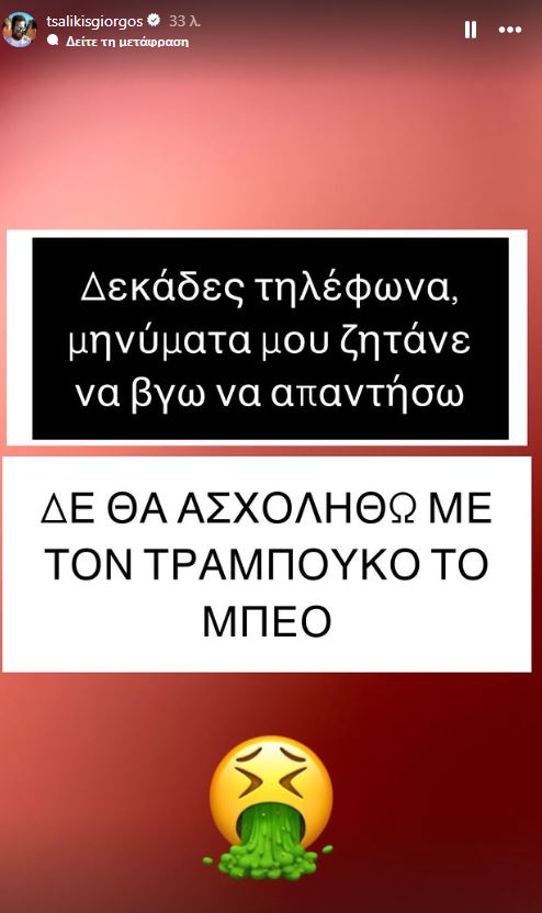 «Δεκάδες τηλέφωνα, μηνύματα, μου ζητάνε να βγω να απαντήσω. Δεν θα ασχοληθώ με τον τραμπούκο τον Μπέο», έγραψε ο Γιώργος Τσαλίκης σε story Instagram.
