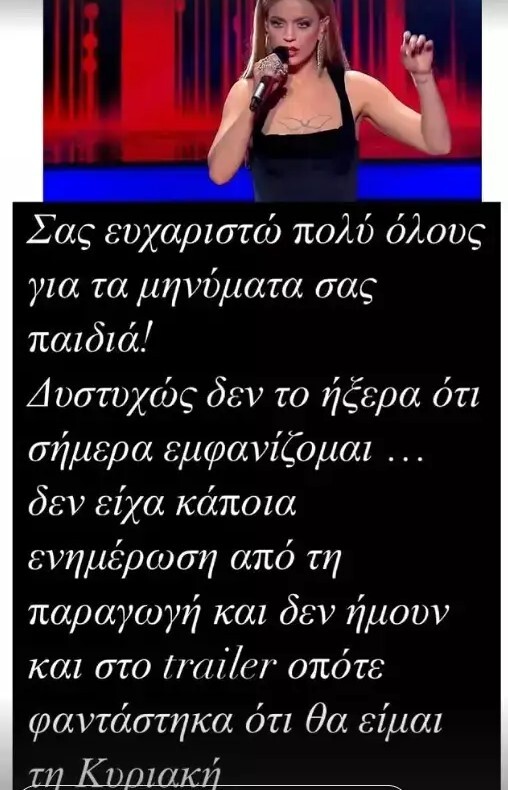 «Δεν είχα κάποια ενημέρωση από την παραγωγή και δεν ήμουν και στο trailer οπότε φαντάστηκα ότι θα είμαι την Κυριακή» επεσήμανε.