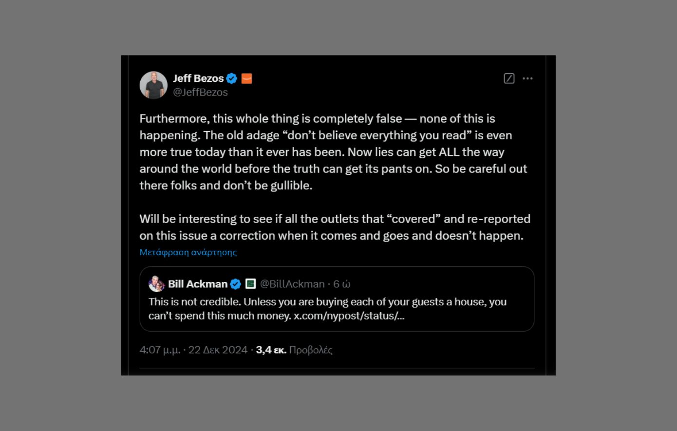 Ο ιδρυτής της Amazon απάντησε σε μια ανάρτηση στο X (πρώην Twitter) που περιείχε πληροφορίες που βρέθηκαν σε πρόσφατο άρθρο της «The New York Post», το οποίο επικαλέστηκε δημοσίευμα της Daily Mail και υποστήριζε ότι ο ίδιος και η αρραβωνιαστικιά του θα έκαναν έναν γάμο 600 εκατομμυρίων δολαρίων στο Άσπεν της Κολομβίας, το Σάββατο 28 Δεκεμβρίου.