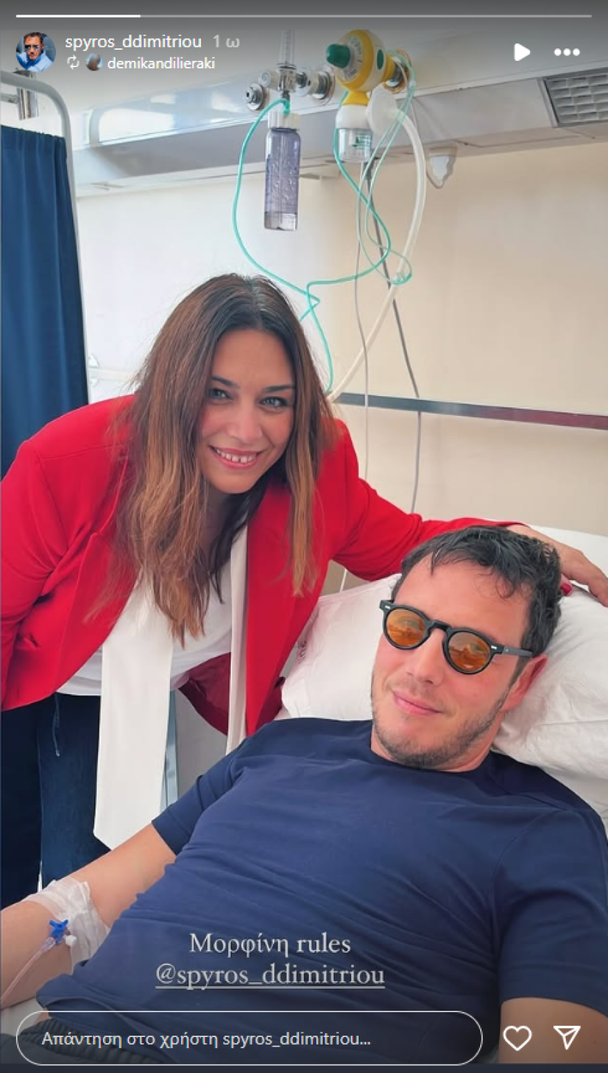 Λίγες ώρες μετά το τροχαίο, ο Σπύρος Δημητρίου δημοσίευσε μία φωτογραφία μέσα από το νοσοκομείο στον προσωπικό του λογαριασμό στο Instagram. Όπως αποκάλυψε έλαβε μορφίνη για να αντιμετωπίσει τον πόνο μετά το τροχαίο ατύχημα.