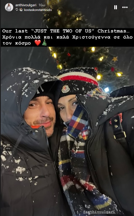 Η δημοσιογράφος και παρουσιάστρια, που διανύει τους τελευταίους μήνες της εγκυμοσύνης της, ανυπομονεί να κρατήσει στα χέρια της το πρώτο της παιδί, ένα όνειρο που ήθελε εδώ και καιρό να πραγματοποιήσει. Στη φωτογραφία που ανέβασε την παραμονή των Χριστουγέννων, στις 24 Δεκεμβρίου, ποζάρει μαζί με τον σύζυγό της σε ένα μαγευτικό χιονισμένο τοπίο, γράφοντας: «Τα τελευταία Χριστούγεννα που θα είμαστε μόνο οι δυο μας. Χρόνια πολλά και καλά Χριστούγεννα σε όλους».
