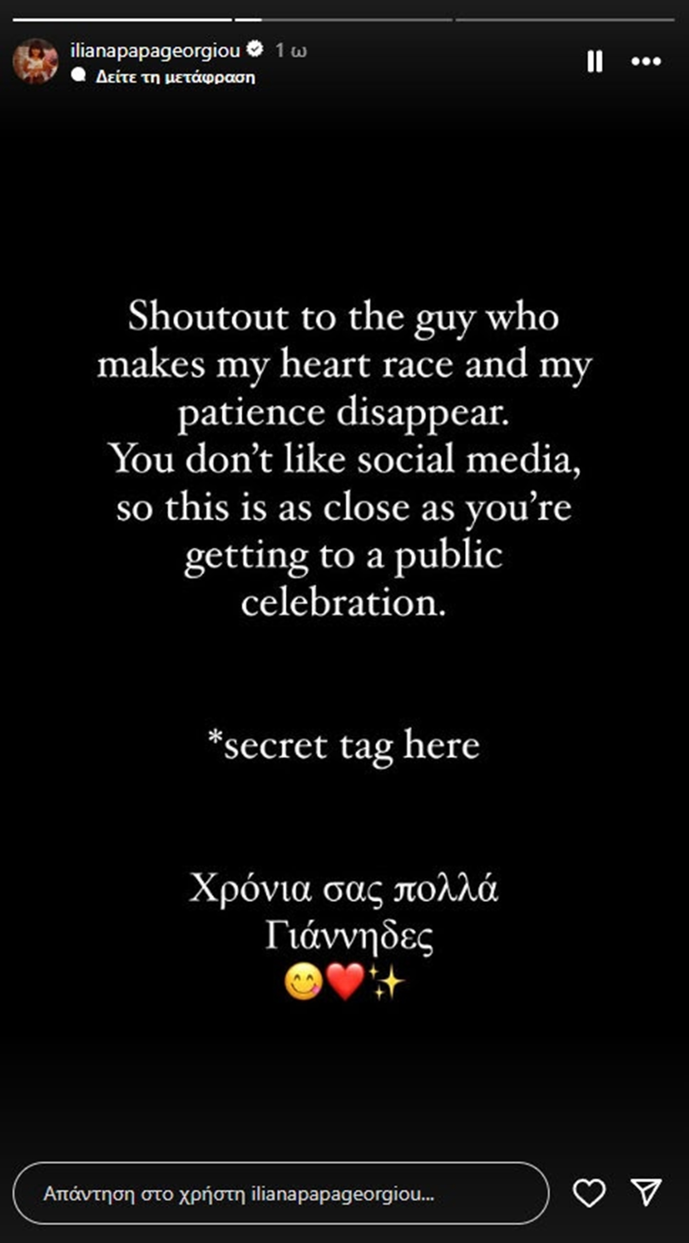 «Φωνάζω στον τύπο που κάνει την καρδιά μου να χτυπά δυνατά και την υπομονή μου να εξαφανίζεται. Δεν σου αρέσουν τα social media, οπότε αυτό (το μήνυμα) είναι σαν μια δημόσια γιορτή», έγραψε η Ηλιάνα Παπαγεωργίου για τον σύντροφό της, σημειώνοντας πως το tag είναι κρυφό, αποφεύγοντας να αναφέρει το όνομά του.