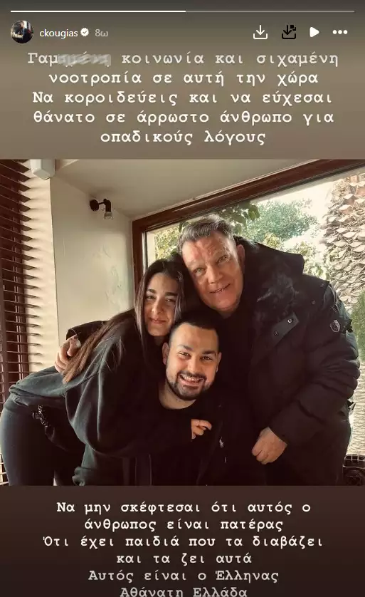 Με μια ανάρτηση στα μέσα κοινωνικής δικτύωσης, ο Χρήστος Κούγιας μοιράστηκε μια οικογενειακή φωτογραφία με τον πατέρα και την αδελφή του, συνοδεύοντάς τη με ένα έντονο μήνυμα, στο οποίο εκφράζει την ενόχλησή του για την κριτική που ασκήθηκε.
