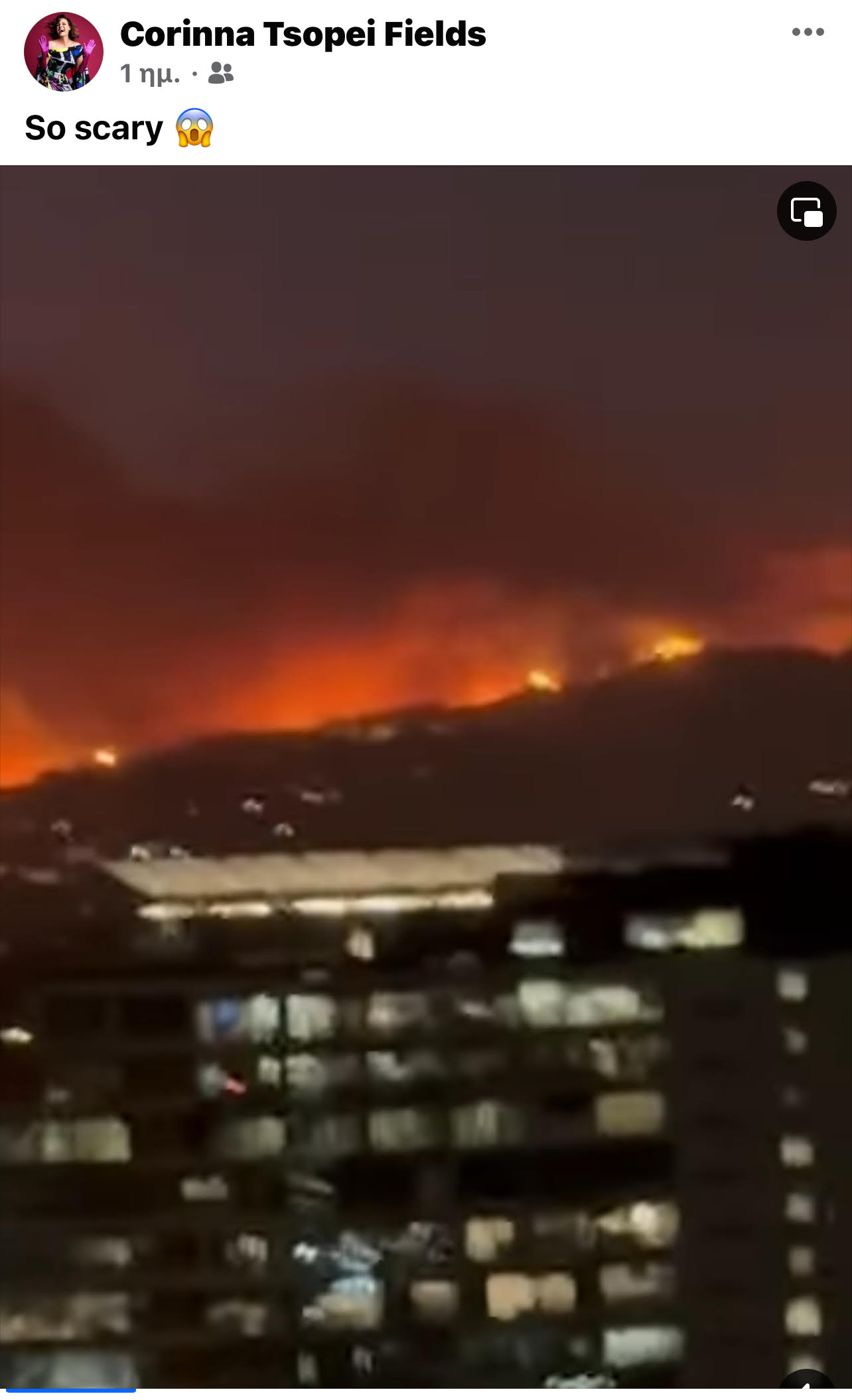 Την ώρα που η Κορίνα Τσοπέη μοιράζεται βίντεο και φωτογραφίες από το παράθυρο της κατοικίας της στον ουρανοξύστη, αποτυπώνοντας την καταστροφική έκταση της φωτιάς στο Pacific Palisades, μια άλλη διακεκριμένη Ελληνίδα, η Αριάννα Χάφινγκτον-Στασινοπούλου δημοσίευσε στον λογαριασμό της σε μέσο κοινωνικής δικτύωσης ότι αναγκάστηκε, μαζί με την οικογένειά της, να εγκαταλείψει το σπίτι της ύστερα από εντολή εκκένωσης.