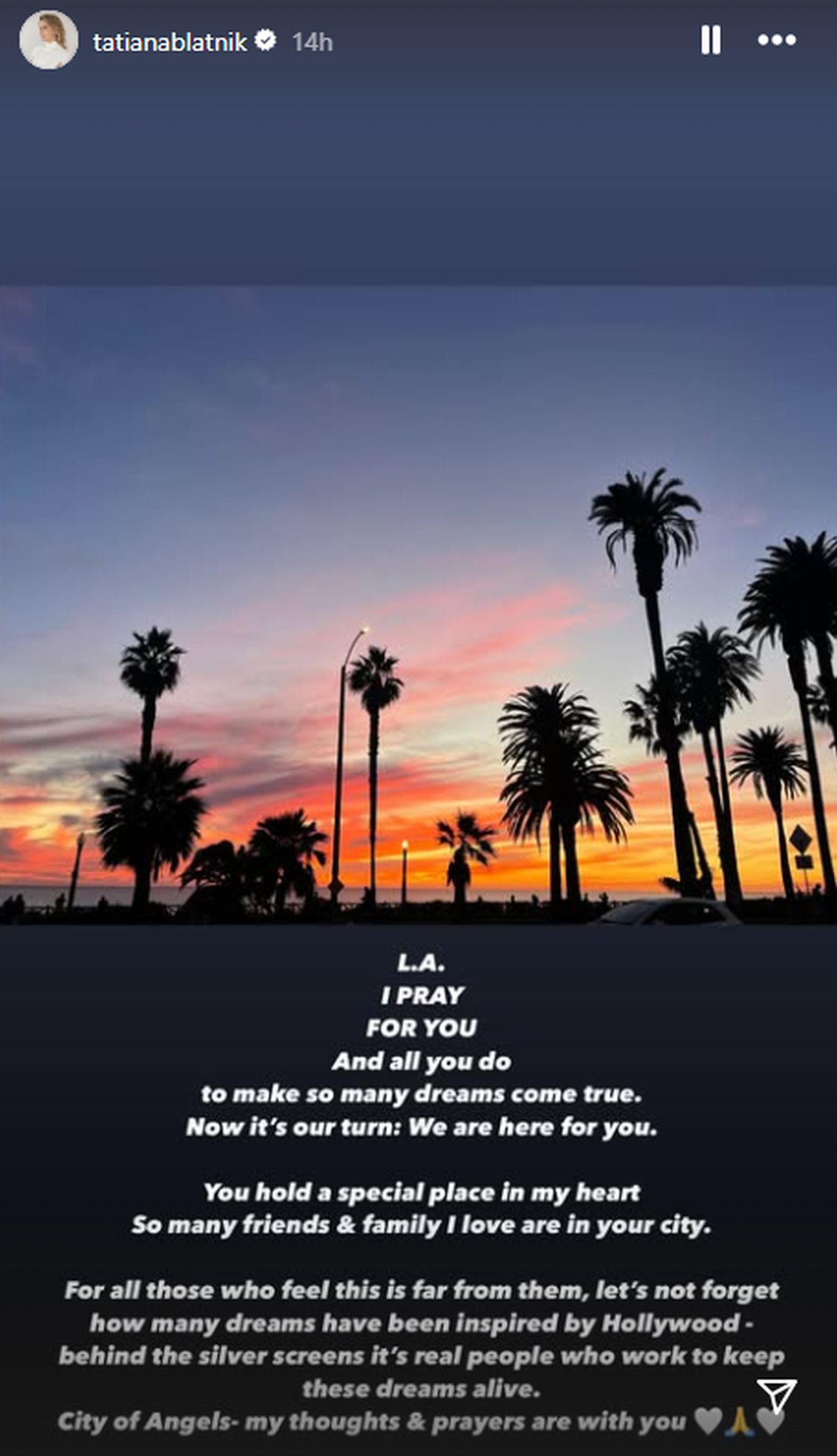 Η πρώην σύζυγος του πρίγκιπα Νικόλαου έγραψε στα Instagram Stories της: «Los Angeles, προσεύχομαι για σένα. Και για όλα όσα κάνεις για να κάνεις τόσα πολλά όνειρα πραγματικότητα. Τώρα είναι η σειρά μας: Είμαστε εδώ για σένα. Έχεις μια ξεχωριστή θέση στην καρδιά μου. Τόσοι φίλοι και άνθρωποι που αγαπώ είναι στην πόλη σου.