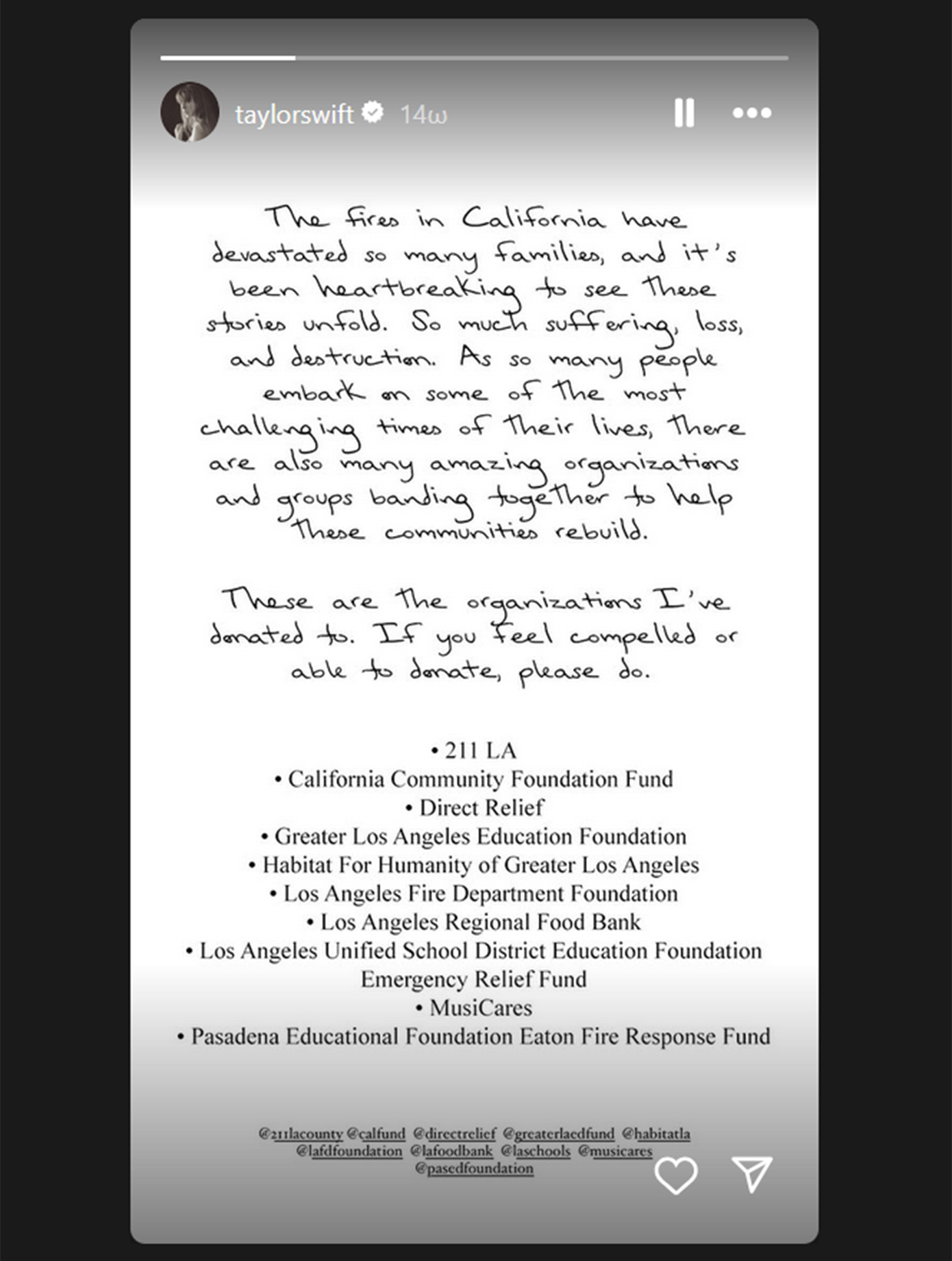 «Τόσα βάσανα, απώλειες και καταστροφές» ανέφερε και δημοσιοποίησε λίστα με οργανώσεις αρωγής που υποστηρίζουν όσους έχουν ανάγκη στην περιοχή του Λος Άντζελες. Η Τέιλορ Σουίφτ εξέφρασε επίσης συμπόνια σε όσους έχασαν τα πάντα στις πρόσφατες πυρκαγιές. «Καθώς τόσοι πολλοί άνθρωποι βιώνουν μερικές από τις πιο δύσκολες στιγμές της ζωής τους, υπάρχουν επίσης πολλές καταπληκτικές οργανώσεις και ομάδες που ενώνονται για να βοηθήσουν αυτές τις κοινότητες να ξαναχτιστούν» πρόσθεσε.