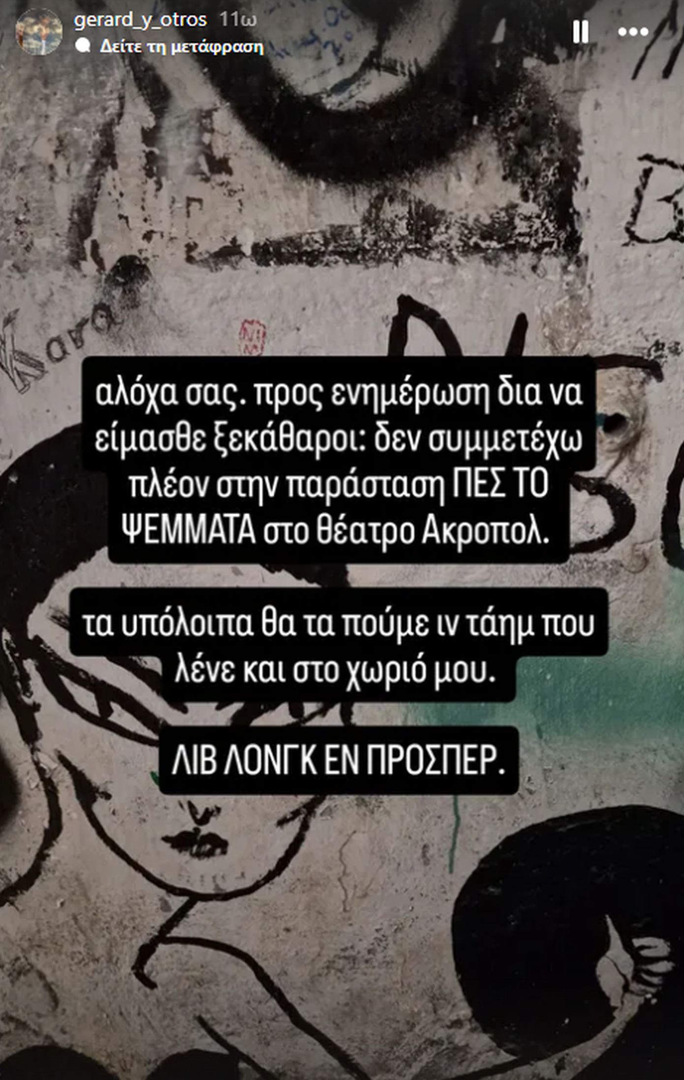 «Καλησπέρα σε όλα τα πλάσματα. Θα ήθελα, για νομικούς λόγους, να σας γνωστοποιήσω ότι έχω αποχωρήσει από την παράσταση “Πες το Ψέματα”, δεν έχω καμία σχέση με την παραγωγή της συγκεκριμένης παράστασης, δεν συμμετείχα σε κανένα στάδιο της παραγωγής και φυσικά, δεν είχα καμία ενημέρωση για το line up τη στιγμή της αποδοχής της συμμετοχής μου.