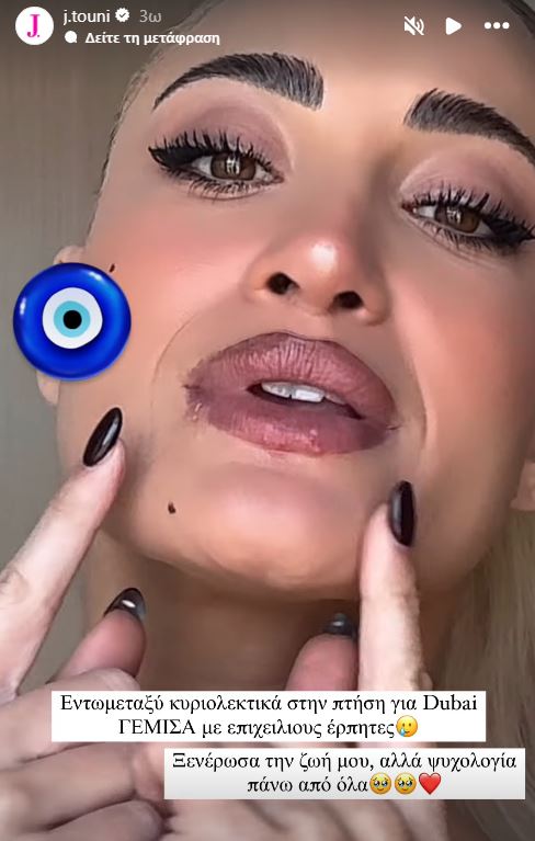 «Και έτσι, για το μάτι, ρε παιδάκι μου, έχω γεμίσει επιχείλιους έρπητες. Αυτό συνέβη χθες στις 4 ώρες πτήσης, δεν το πίστευα, άρχιζα να φαγουρίζομαι σαν σκυλί και γέμισα. Βασικά, αυτό είναι στα όρια στοματίτιδας. Δεν ξέρω τι θα κάνω, τον σταυρό μου, λογικά, θα σας μιλάω από μακριά στα επόμενα στόρι, πόνος, χάλι και φαγούρα» ανέφερε χαρακτηριστικά η Ιωάννα Τούνη στο βίντεο που ανέβασε στο Instagram.