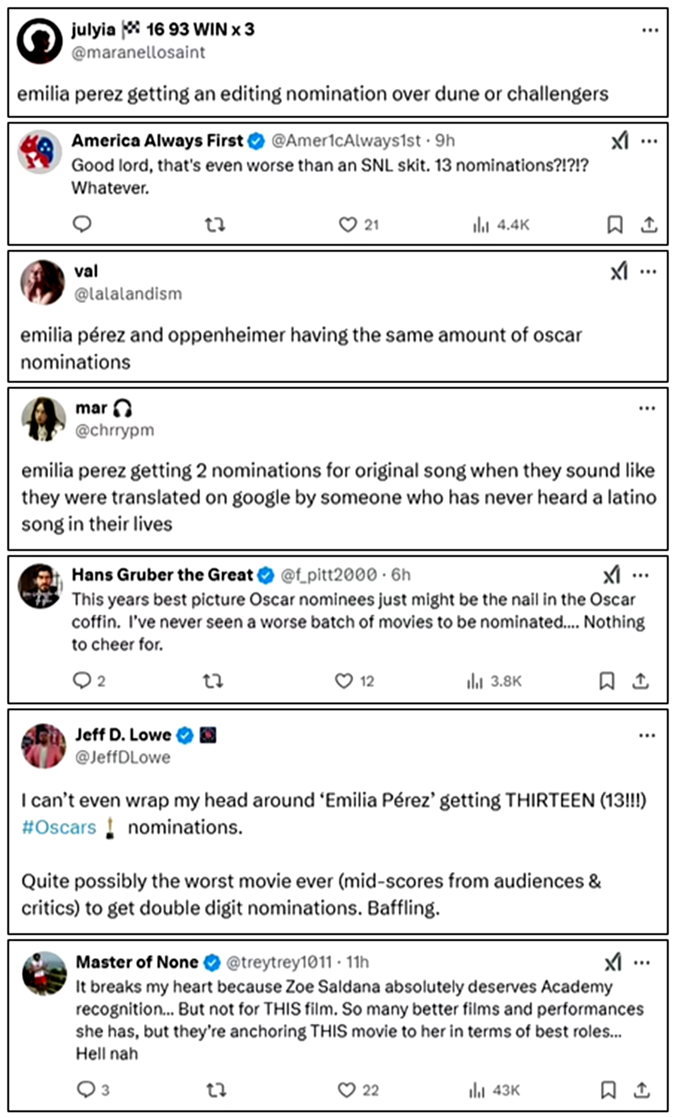 - «Δεν μπορώ να πιστέψω ότι το ‘Emilia Pérez’ πήρε ΔΕΚΑΤΡΕΙΣ υποψηφιότητες για Όσκαρ. Ίσως η χειρότερη ταινία που έχει πάρει διψήφιο αριθμό υποψηφιοτήτων. Ανεξήγητο».
