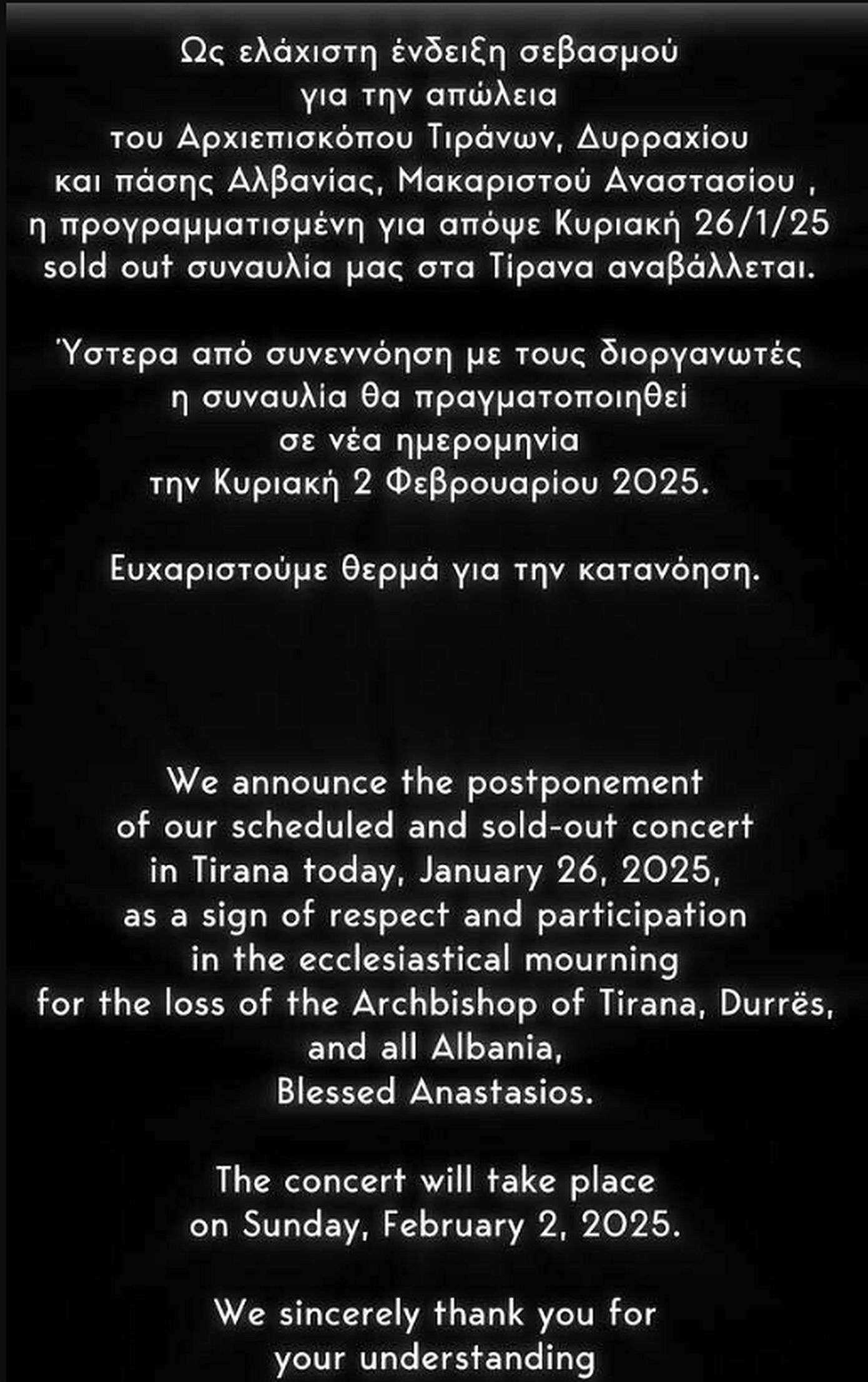 «Ως ένδειξη σεβασμού για την απώλεια του Αρχιεπισκόπου Τιράνων, Δυρραχίου και πάσης Αλβανίας, Μακαριστού Αναστασίου η προγραμματισμένη για απόψε Κυριακή 26/1/25 sold out συναυλία μας στα Τίρανα αναβάλλεται.