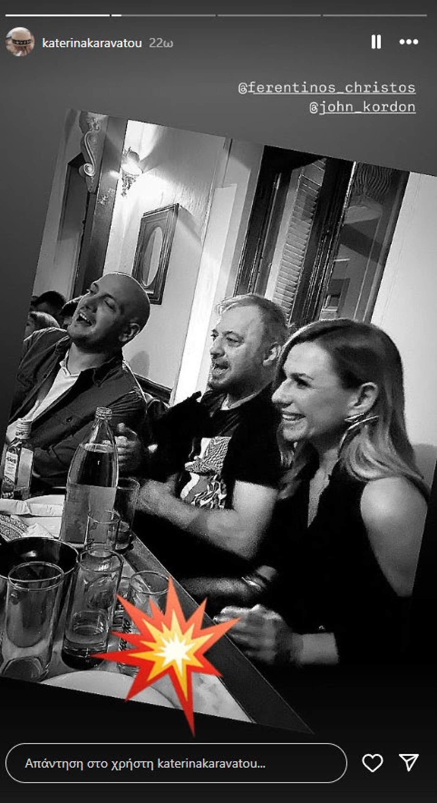 Η ανάρτηση έδειχνε την ίδια να απολαμβάνει την παρέα και τη διασκέδαση, με τον γνωστό παρουσιαστή να βρίσκεται δίπλα της. Υπενθυμίζεται ότι πριν από λίγους μήνες είχαν υπάρξει φήμες που τους ήθελαν ζευγάρι, τις οποίες η Κατερίνα Καραβάτου είχε διαψεύσει σε δηλώσεις της, χαρακτηρίζοντας τον Χρήστο Φερεντίνο ως έναν εξαιρετικό συνεργάτη, με τον οποίο φέτος δουλεύουν μαζί στο ραδιόφωνο.