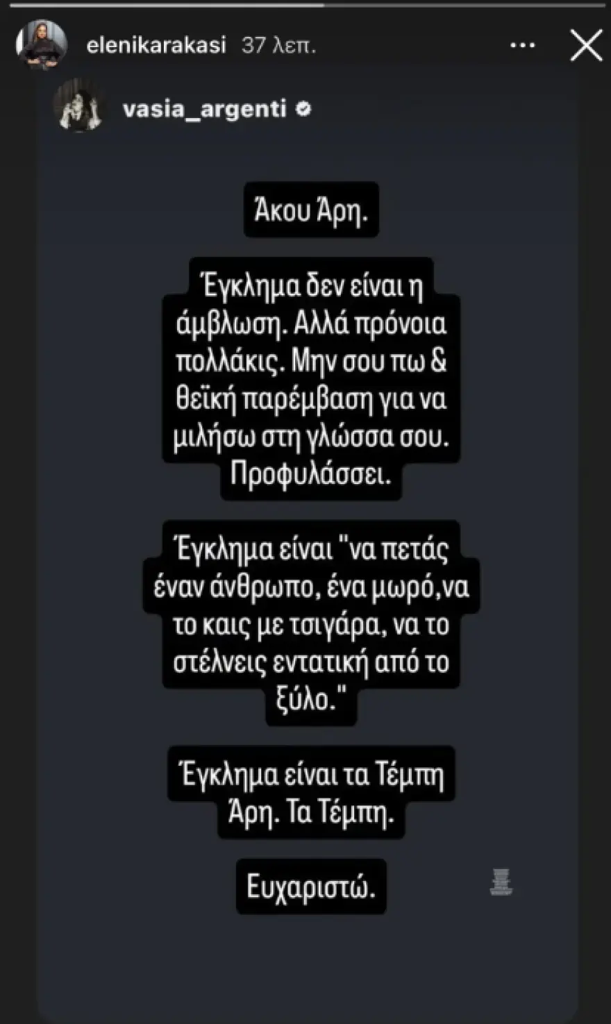 «Άκου Άρη. Έγκλημα δεν είναι η άμβλωση. Αλλά πρόνοια πολλάκις. Μην σου πω και θεϊκή παρέμβαση για να μιλήσω στη γλώσσα σου. Προφυλάσσει. Έγκλημα είναι “να πετάς έναν άνθρωπο, ένα μωρό, να το καις με τσιγάρα, να το στέλνεις στην εντατική από το ξύλο”. Έγκλημα είναι τα Τέμπη Άρη. Τα Τέμπη. Ευχαριστώ».