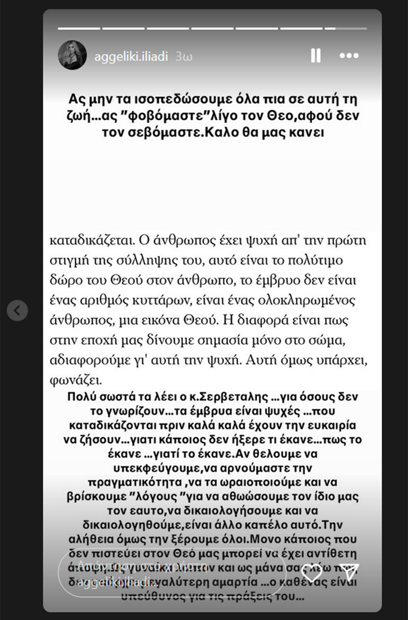 «Ας μη τα ισοπεδώσουμε όλα πια σε αυτή τη ζωή. Ας “φοβόμαστε” λίγο τον Θεό, αφού δεν τον σεβόμαστε. Καλό θα μας κάνει. Πολύ σωστά τα λέει ο κ. Σερβετάλης. Για όσους δεν το γνωρίζουν, τα έμβρυα είναι ψυχές, που καταδικάζονται πριν καλά καλά έχουν την ευκαιρία να ζήσουν γιατί κάποιος δεν ήξερε τι έκανε, πως το έκανε, γιατί το έκανε. Αν θέλουμε να υπεκφεύγουμε, να αρνούμαστε την πραγματικότητα, να τα ωραιοποιούμε και να δικαιολογηθούμε, είναι άλλο καπέλο αυτό. Την αλήθεια όμως την ξέρουμε όλοι. Μόνο κάποιος που δεν πιστεύει στον Θεό μας μπορεί να έχει αντίθετη άποψη. Ως γυναίκα λοιπόν, και ως μάνα σας λέω πως δεν υπάρχει μεγαλύτερη αμαρτία, ο καθένας είναι υπεύθυνος για τις πράξεις του», έγραψε η Αγγελική Ηλιάδη.