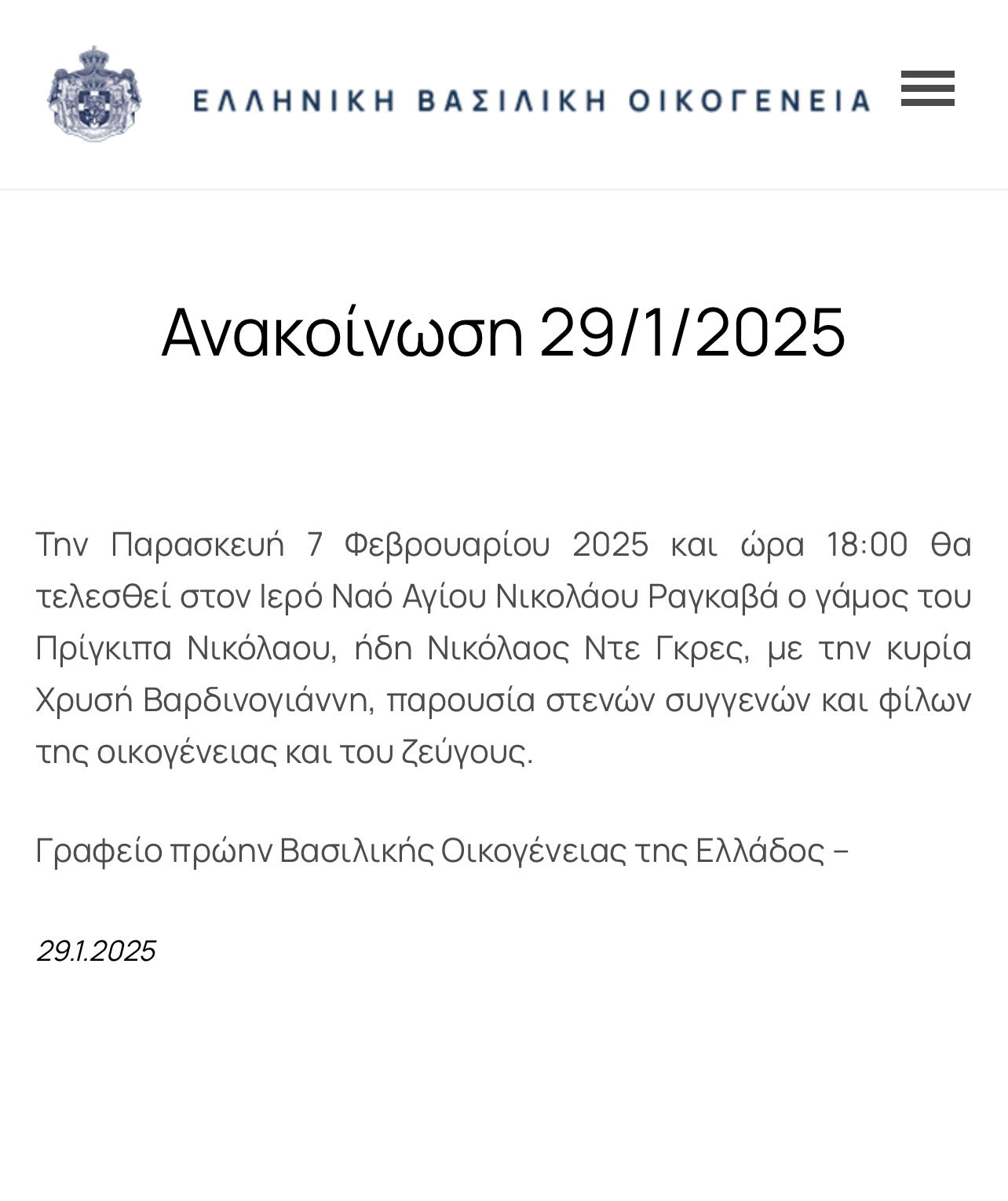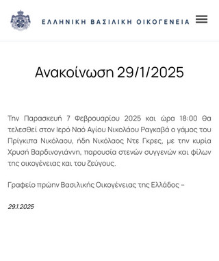Αναλυτικά, η ανακοίνωση του γραφείου Τύπου αναφέρει: «Την Παρασκευή 7 Φεβρουαρίου 2025 και ώρα 18.00 θα τελεσθεί στον Ιερό Ναό Αγίου Νικολάου Ραγκαβά ο γάμος του πρίγκιπα Νικόλαου, ήδη Νικόλαος Ντε Γκρες, με την κυρία Χρυσή Βαρδινογιάννη, παρουσία στενών συγγενών και φίλων της οικογένειας και του ζεύγους».