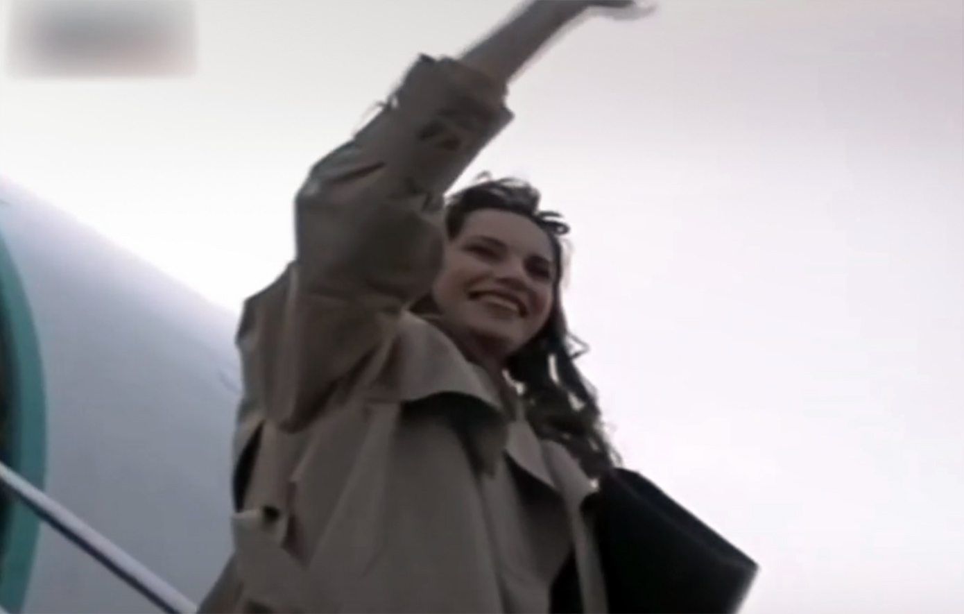 Στο ξεχασμένο αυτό διαφημιστικό, η 23χρονη τότε Μελάνια προσγειώνεται στην άσφαλτο φορώντας ένα oversized μπεζ trench coat, ενώ το στυλ της αντικατοπτρίζει τη δεκαετία του ’90: baggy blazer με χρυσά κουμπιά, ταγιέρ σε ασορτί χρώμα και ριγέ κίτρινο φουλάρι δεμένο κομψά στον λαιμό της.