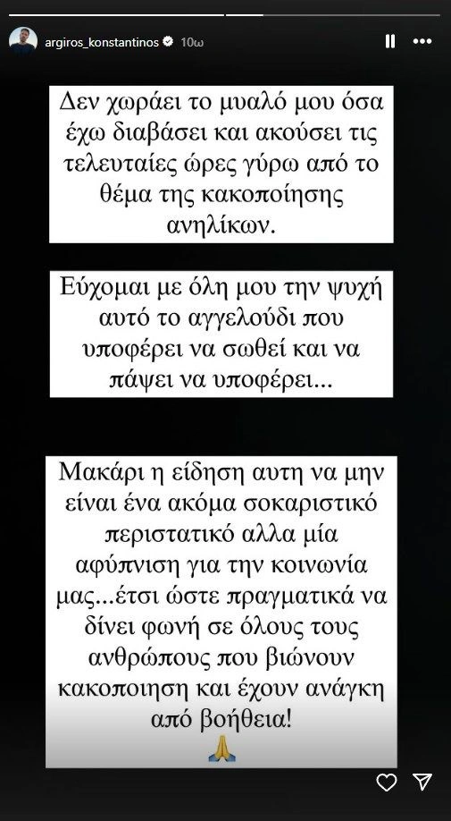 Με ανάρτησή του στον λογαριασμό του στο Instagram ο Κωνσταντίνος Αργυρός αναφέρθηκε στο σοκαριστικό περαστικό της κακοποίησης του 3χρονου αγοριού στην Κρήτη από τη μητέρα και τον σύντροφό της.