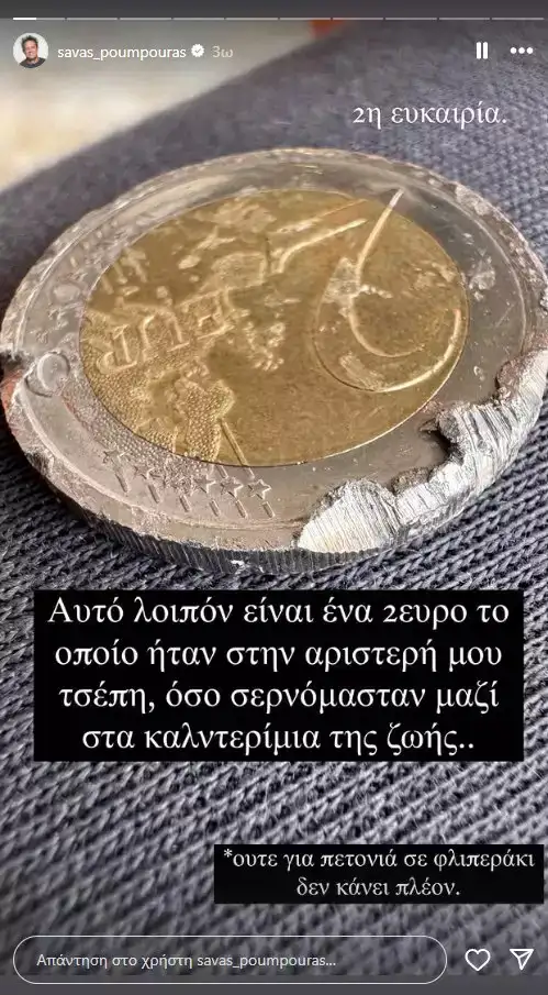 «2η ευκαιρία. Αυτό λοιπόν είναι ένα 2ευρο, το οποίο ήταν στην αριστερή μου τσέπη, όσο σερνόμασταν μαζί στα καλντερίμια της ζωής… Ούτε για πετονιά σε φλιπεράκι δεν κάνει πλέον», έγραψε στην πρώτη φωτογραφία ο Σάββας Πούμπουρας.