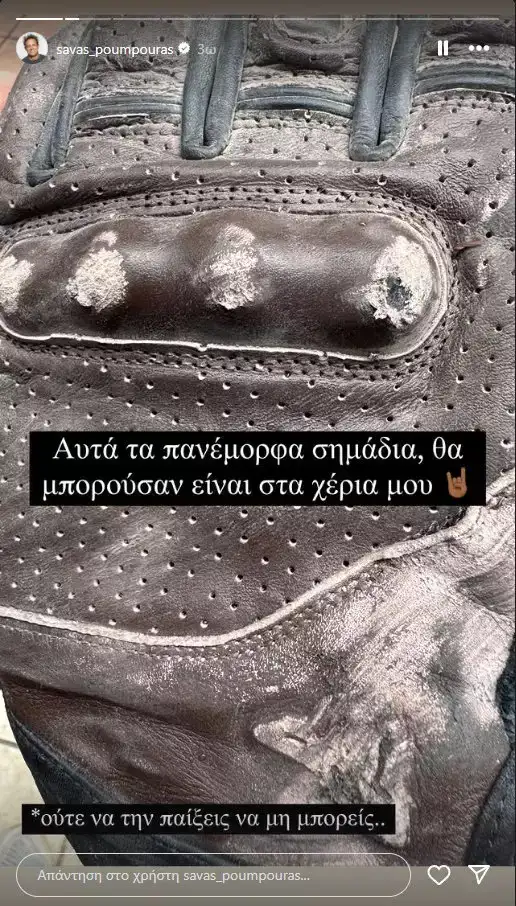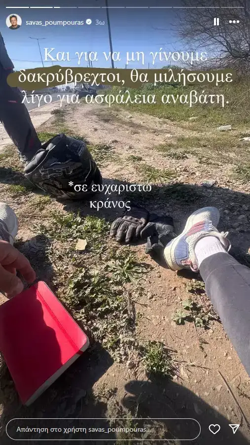 Τέλος, ο Σάββας Πούμπουρας δημοσίευσε φωτογραφία με το κράνος του: «Και για να μη γίνουμε δακρύβρεχτοι, θα μιλήσουμε λίγο για την ασφάλεια αναβάτη. Σε ευχαριστώ, κράνος» έγραψε ο Σάββας Πούμπουρας, αποφεύγοντας να γνωστοποιήσει λεπτομέρειες του ατυχήματος.