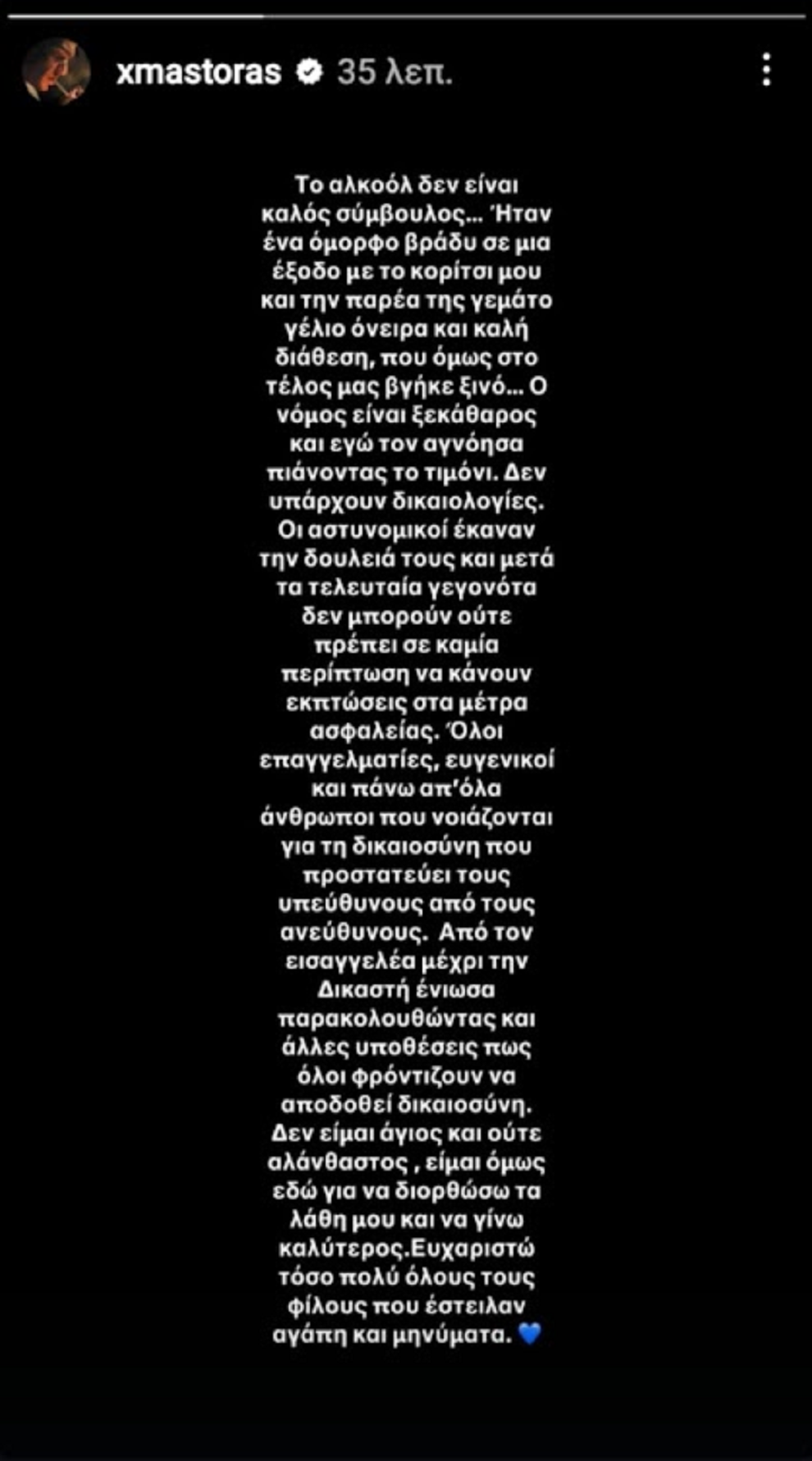 «Το αλκοόλ δεν είναι καλός σύμβουλος… Ήταν ένα όμορφο βράδυ σε μια έξοδο με το κορίτσι μου και την παρέα της, γεμάτο γέλιο, όνειρα και καλή διάθεση, που όμως στο τέλος μάς βγήκε ξινό… Ο νόμος είναι ξεκάθαρος και εγώ τον αγνόησα πιάνοντας το τιμόνι.