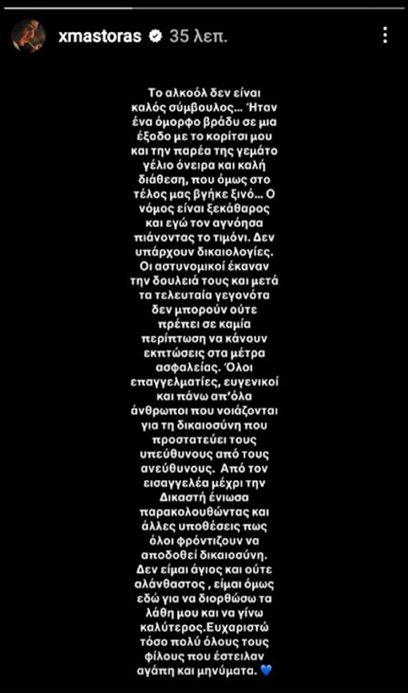 Από τον εισαγγελέα μέχρι τη δικαστή ένιωσα παρακολουθώντας και άλλες υποθέσεις πως όλοι φροντίζουν να αποδοθεί δικαιοσύνη. Δεν είμαι άγιος και ούτε αλάνθαστος, είμαι όμως εδώ για να διορθώσω τα λάθη μου και να γίνω καλύτερος. Ευχαριστώ τόσο πολύ όλους τους φίλους που έστειλαν αγάπη και μηνύματα», έγραψε χαρακτηριστικά ο Χρήστος Μάστορας.