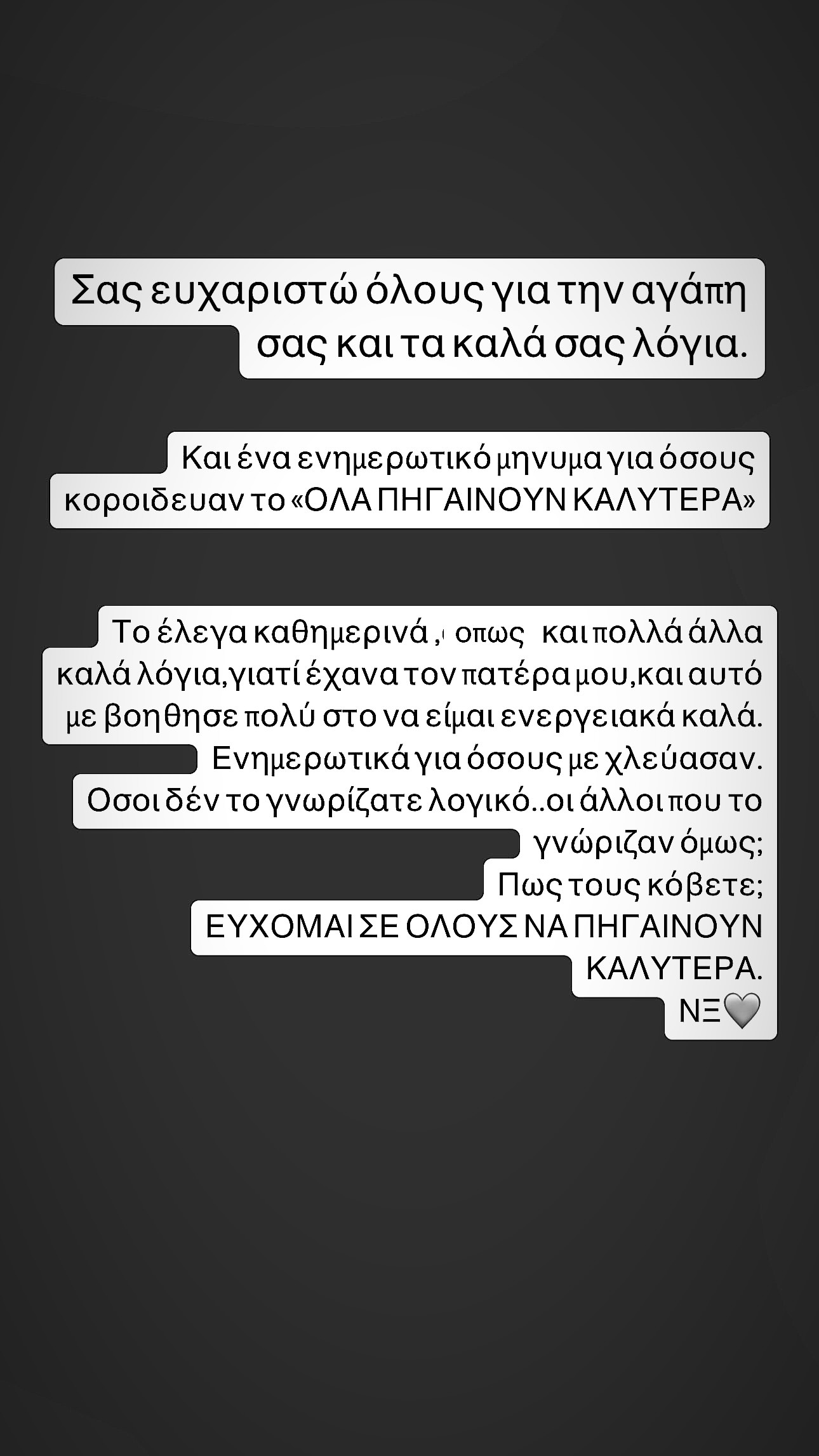 «Σας ευχαριστώ για την αγάπη σας και τα καλά σας λόγια. Και ένα ενημερωτικό μήνυμα για όσους κοροϊδεύαν το “Όλα πηγαίνουν καλύτερα”. Το έλεγα καθημερινά, όπως και πολλά άλλα καλά λόγια, γιατί έχανα τον πατέρα μου και αυτό με βοηθούσε στο να είμαι ενεργειακά καλά. Ενημερωτικά, για όσους με χλεύασαν. Όσοι δεν το γνωρίζατε, λογικό, οι άλλοι που γνώριζαν όμως; Πώς τους κόβετε; Εύχομαι σε όλους να πηγαίνουν καλύτερα» έγραψε στην ανάρτησή του ο Νίνο.